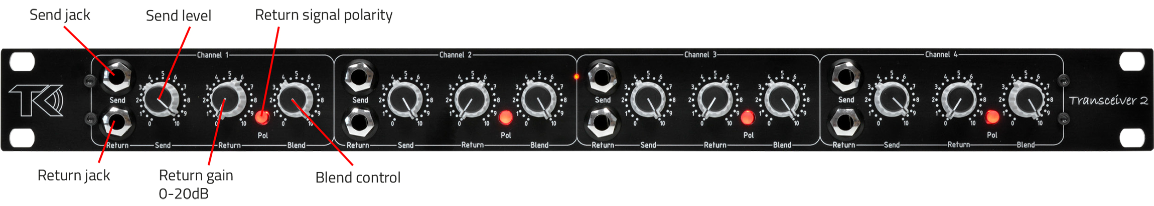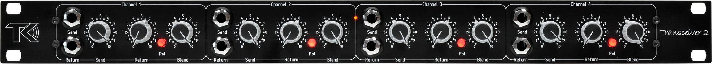 The Transceiver is a four channel insert station. The main function is to convert +4dB balanced signals to unbalanced and back again. Each channel has a send level, the return has a gain control and a polarity switch. Among other things you can use The Transceiver to do the following: