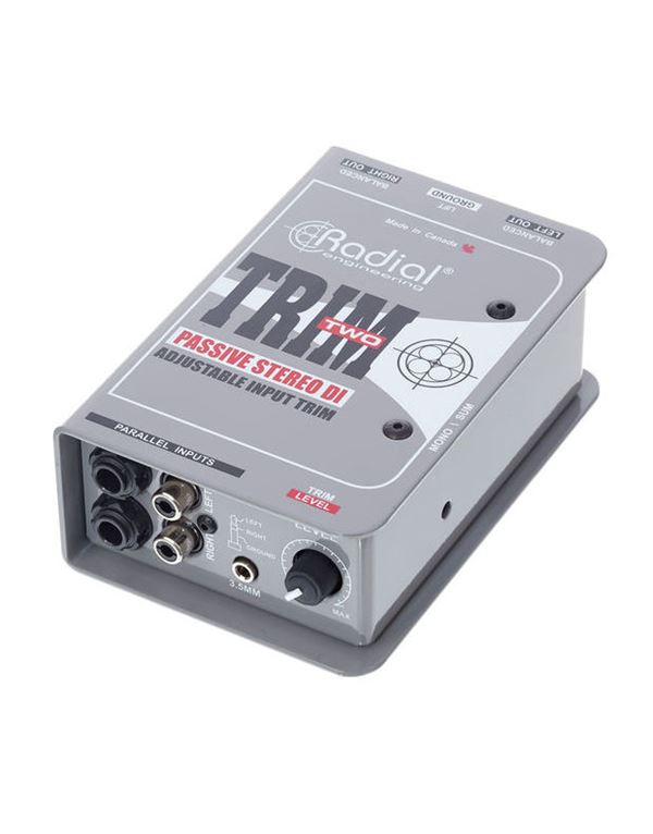 RADIAL Trim-Two Passive DI Box Stereo, υψηλής απόδοσης μετατροπέας ήχου, έτοιμος για χρήση, χωρίς ανάγκη οδηγών εγκατάστασης σε υπολογιστή. Διαθέτει  RCA,  1/4 και 3.5mm, απόκριση συχνότητας 30 - 20.000 Hz, 2x 6,3mm jack Input, 2x RCA Input, 1x 3,5mm Stereo-jack Input, XLR L/R output, switchable Gnd/Lift και μεταλλική κατασκευή.