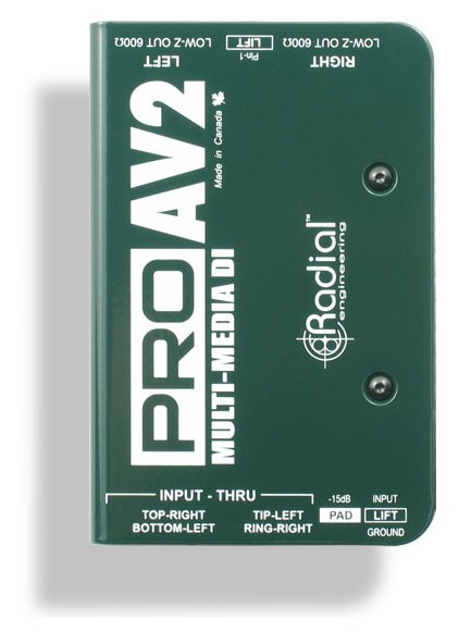 The Radial ProAV2 is a passive direct box specifically developed with the audio-video integrator in mind. It has full two-channel stereo functionality. To eliminate the need for various adaptor, a "Swiss Army" array of connections are provided, including 1/4" for instruments, RCA and 1/8" connectors for consumer electronics and computers, and a +4dB XLR input for professional systems. Front panel connectors can also be used as thru-puts to allow multiple patch points.
