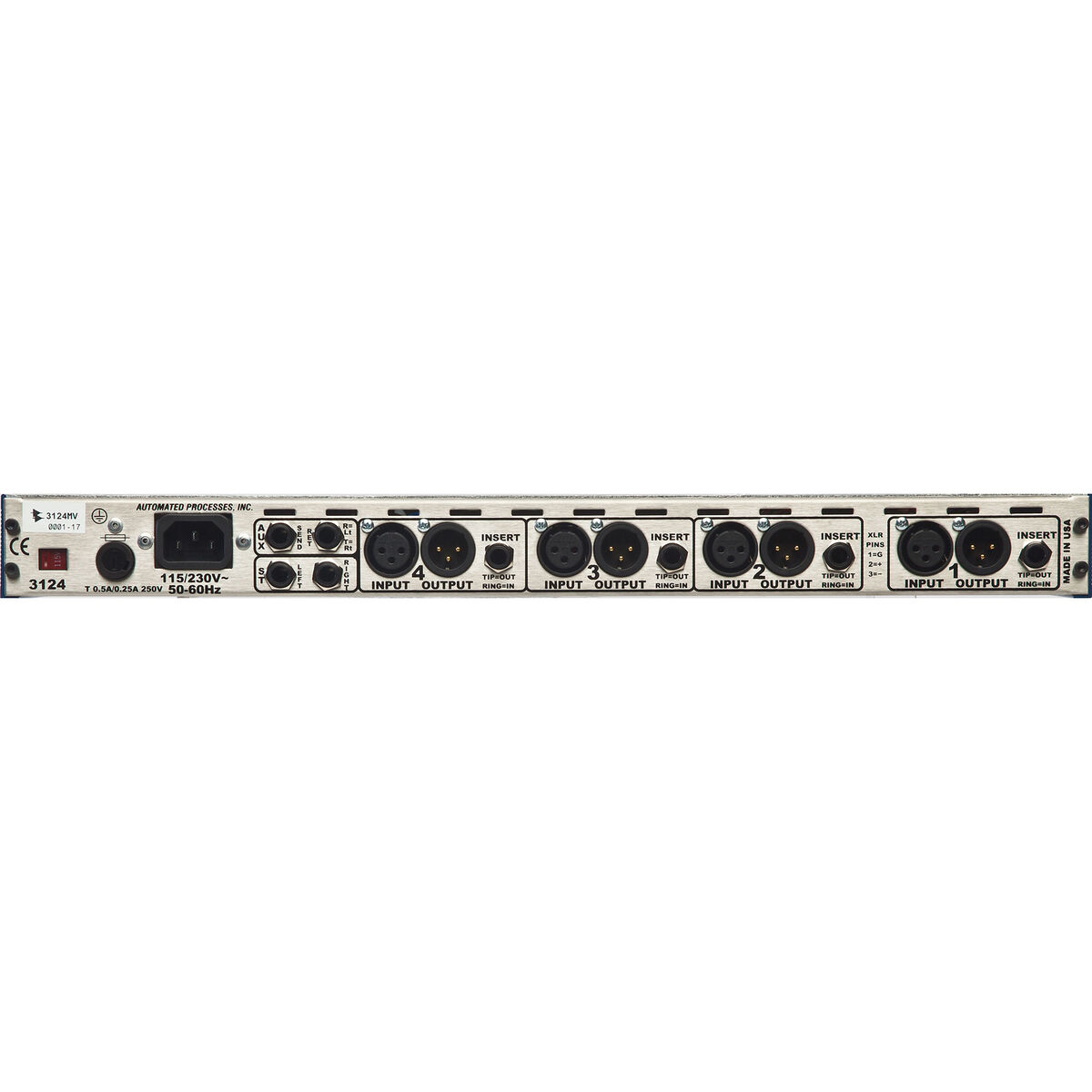 Both the 3124V and the 3124MV are designed with the professional engineer in mind. Both units give four channels of the highest possible quality mic preamp. However, the 3124MV provides an additional audio mixer with a transformer balanced output, keeping the unit size and price reasonable. Both models are equally at home in the control room, studio, and recording truck or on stage. The 3124MV utilizes the same microphone preamp circuit that is used in all API consoles. It is equipped with the AP2516 input transformer and the proprietary output transformer found in all API mic pres and throughout the API product line. The unit offers Variable Output Level Control, switchable 3:1 output transformer selection, and an internal 48-volt phantom power supply, which is front panel switchable for each channel. Also provided is a front panel -20 dB pad switch that affects both the mic and line in. A 1/4" phone jack is available on the rear panel for each channel as an insert tip-send/ ring-return placed between the mic pre amp output and the mixer input. Like the 3124V, the 3124MV provides up to 65 dB of gain. The Hi-Z front panel input goes directly to the op-amp, allowing a low level input such as a guitar or bass to be amplified without a matching transformer or direct box. This Hi-Z input can accept input levels as high as +20 dBu, making it perfect for keyboards and other high level devices. The rear output is an XLR connector. Additionally, the 3124MV adds a stereo panner with a level control, and a post "fader" aux send. The stereo panners and the aux sends are bussed to master output controls and then to the rear panel jacks. A stereo AUX return is provided to return effects or cascade additional mixers for more inputs. The unique stereo aux return control acts to balance the left/right signal, yet staying stereo. It can also be used as a mono return.