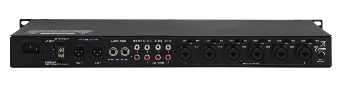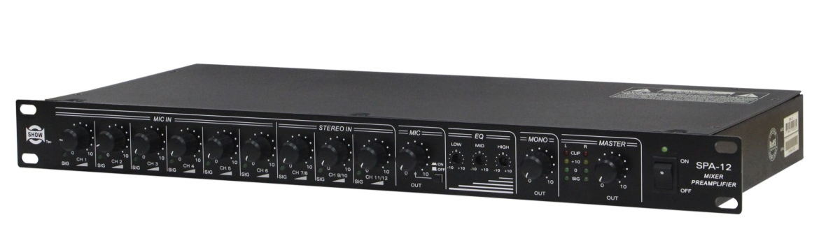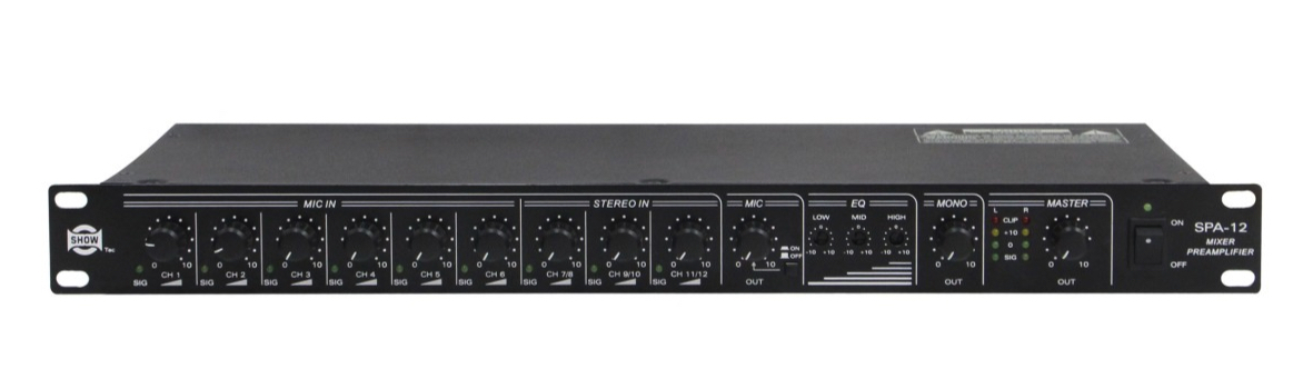 Show SPA-12, επαγγελματικός προ-ενισχυτής με 6 Line/MIC εισόδους combo, 3 στερεοφωνικές εισόδους RCA και phantom power για κάθε μικροφωνικό κανάλι. Είναι εύκολος στη χρήση και ιδανικός για σκηνές, ηχογραφήσεις και PA εγκαταστάσεις.