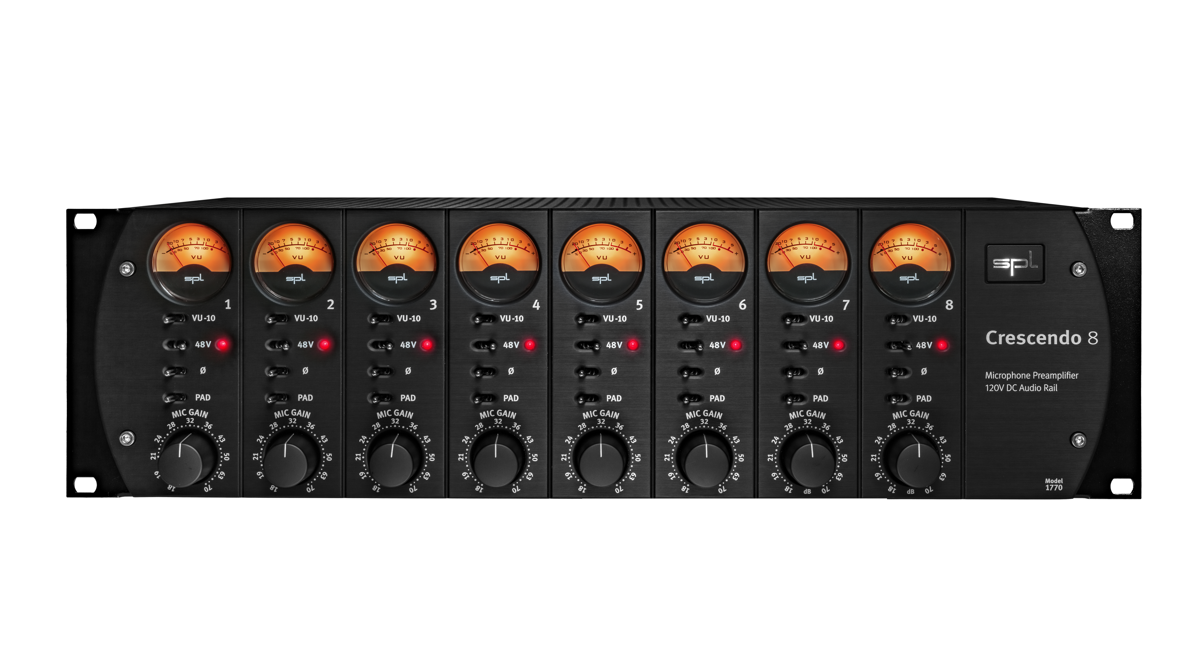 Crescendo 8 combines the precise sound that German Rundfunk-Technik is famous for with the innovative SPL 120V technology. The internal operating voltage of 120 volts allows Crescendo microphone preamplifiers to break completely new ground. This results in microphone preamps that sound detail-rich, vivid and equally honest.