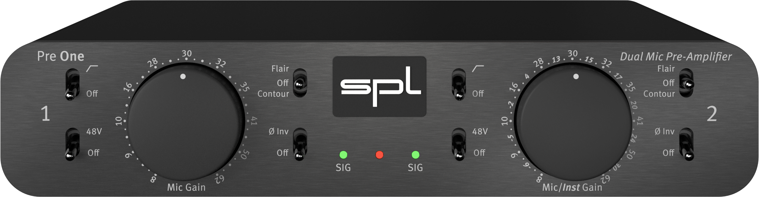 Each preamp features an independent 6 dB per octave high-pass filter for subsonic rumbles, switchable 48V phantom power, and a 180° polarity reversal switch. Each preamp features a selector, so you can choose Flair or Contour, analog EQ presets, and on the rear panel, you have a channel-selectable -20 dB input pad for overly hot signals. Each preamp features a balanced XLR 3-pin mic input and its own dedicated 1/4" TRS balanced output. Preamp 2 also includes a 1/4" TS instrument input (which automatically deactivates the mic input on preamp 2). This design allows the Pre One to process stereo signals if desired. Like all SPL products, the Pre One is manufactured in Germany.