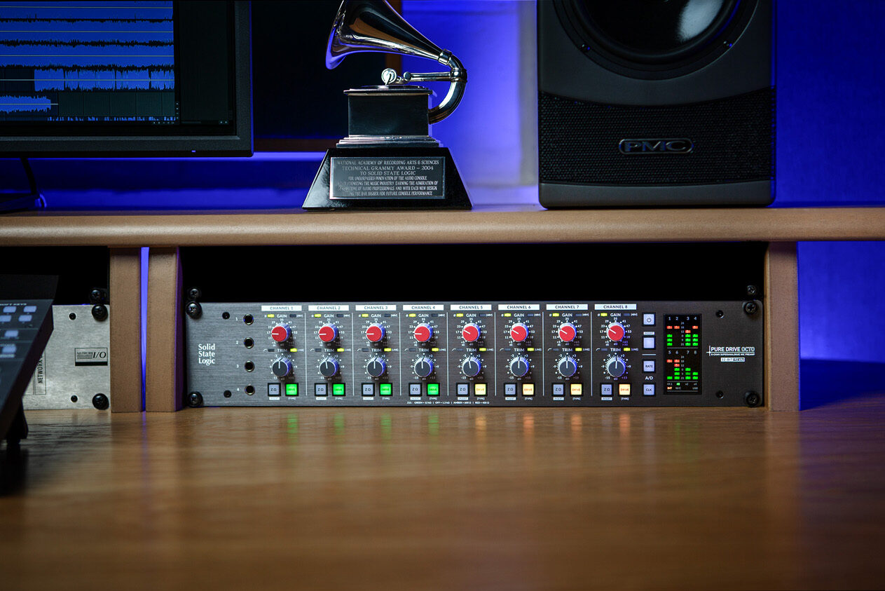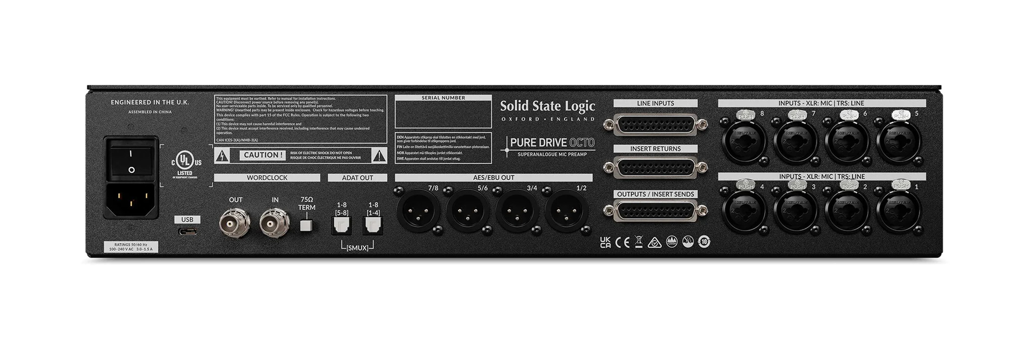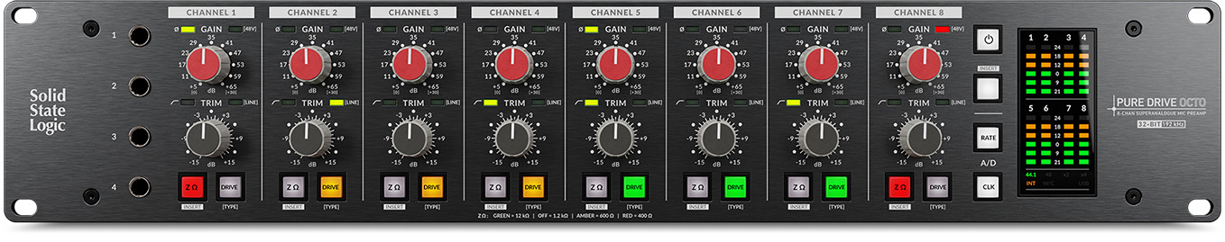 The PURE DRIVE OCTO harnesses Solid State Logic's renowned SuperAnalogue PureDrive™ microphone preamp technology, originally featured in the ORIGIN console. This advanced unit introduces a new DRIVE mode, comprehensive connectivity, and state-of-the-art digital conversion, all within a compact 8-channel 2U rackmount format. The ORIGIN recording console, a contemporary-classic from SSL, first introduced the groundbreaking PureDrive™ microphone preamplifier. This innovative preamp maintains the clarity and punch of SSL's previous designs while also offering the flexibility to switch its character to a warm, harmonically rich, and driven tone that varies with gain.