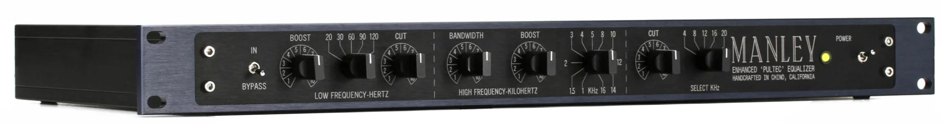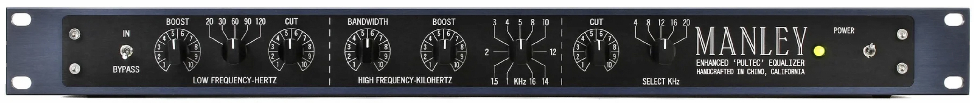 • The MANLEY PULTEC EQP-1A, available in both single and 2-channel versions, uses 1 x 12AX7WA and 1 x 6414 (or 5965) in our ALL-TUBE single-ended line amplifier for the gain make-up and extra-beefy sound; gain is factory set for unity but additional gain is available by a rear mounted feedback adjustment trimpot. Like our 40dB Mic Preamps, the Manley Pultecs offer both transformer coupled balanced and direct capacitor coupled unbalanced outputs for easy interface and sonic variety. Kick drum? Bring on the Pultecs and all the iron you can muster! You'll soon discover the power and magic of having those individual Low Frequency BOOST and CUT controls in that LF shelf circuit. . . Need a little clarity or extension? Try that middle bell-shaped Boost dialing in the sharpness of the boost on the BANDWIDTH control. Something bugging you? Ease it off with the HF shelf cut. You'll see. There's no substitute for a what a Manley Pultec EQ can do!