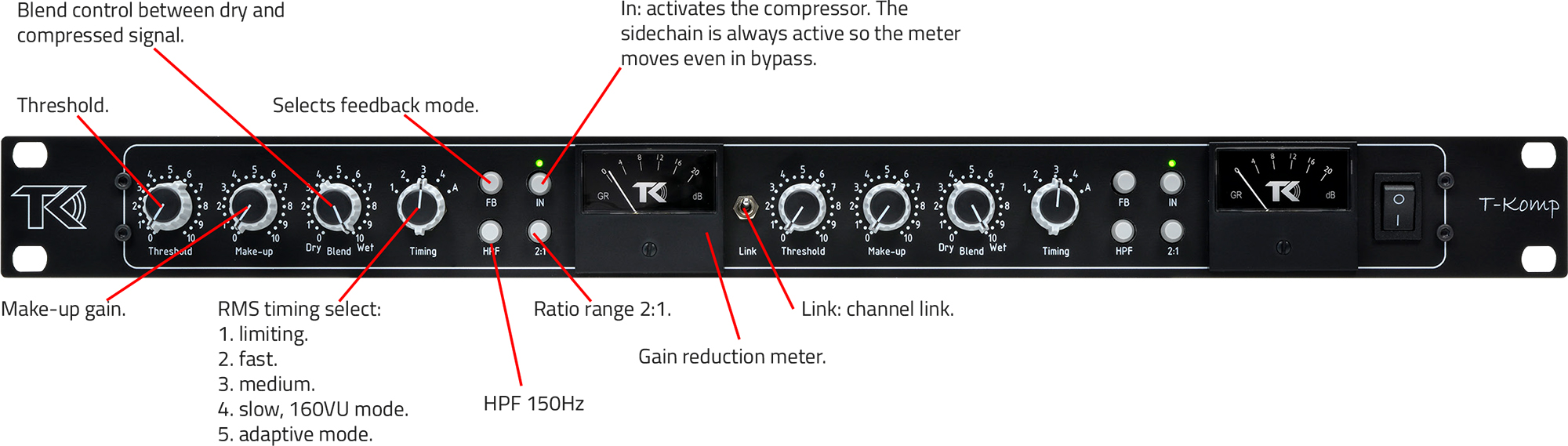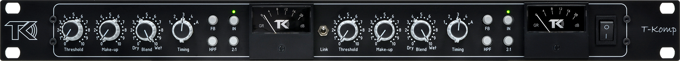The T-Komp has a unique design that offers a modern take on the old vari-mu ratio curve. The ratio is level-dependent and increases with the signal level, a feature that will give you numerous possibilities. To make the T-Komp more useful it has two ratio ranges. The first one goes up to 20:1, perfect for instrument tracking and smashing drums, etc., the second, 2:1, is a more narrow range which makes it more suitable for bus compression.