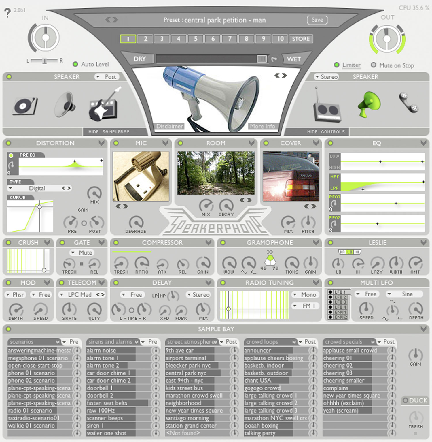 To Speakerphone™2 χρησιμοποιώντας τη φιλοσοφία του Altiverb™ συνδιάζει μιά μεγάλη πoικιλία από εφέ όπως και μια μηχανή convolution που χρησιμοποιεί πραγματικά δείγματα και ανακλάσεις από εκατοντάδες ηχεία, ραδιοφωνικούς δέκτες, θορύβους εγγραφέων, γενήτρια παρασίτων, συμπίεση GSM κινητών τηλεφώνων και πολλά άλλα εφέ που μπορούν να συνδιαστούν σε όλους τους χώρους που διαθέτει. Οι δυνατότητες είναι σχεδόν άπειρες.