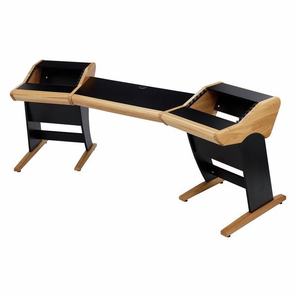Onda is perfectly suited to the demands of hybrid studios. It offers vast amounts of desk space at its center, leaving room for DAW controllers, desktop interfaces or synthesizers in addition to the obligatory keyboard and mouse. Angled racks on each side of this central working space provide a total of twelve rack units – plenty of room for your most valued mic preamps, compressors, and EQs. And while your sound processors sit readily available and easy to reach, the desk layout still manages to keep them out of the way of your monitors, so it does not interfere with your acoustics.