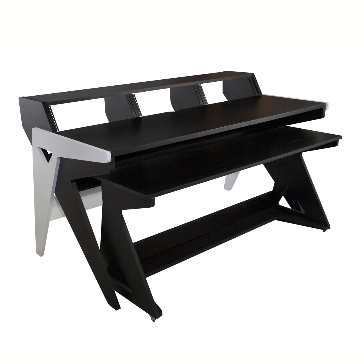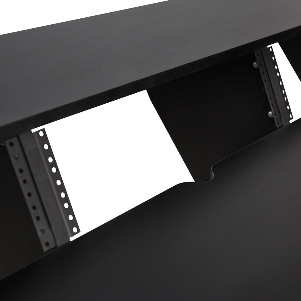 The large main desk leaves enough room for keyboard and mouse, controllers and your notes. Then there are the three racks with three units each, ready to house your 19-inch hardware gear. The slanted rack setup allows for comfortable reading and control of any devices mounted here, all right at your fingertips. Above the racks is an additional shelf for computer screens, loudspeakers or accessories as you require.