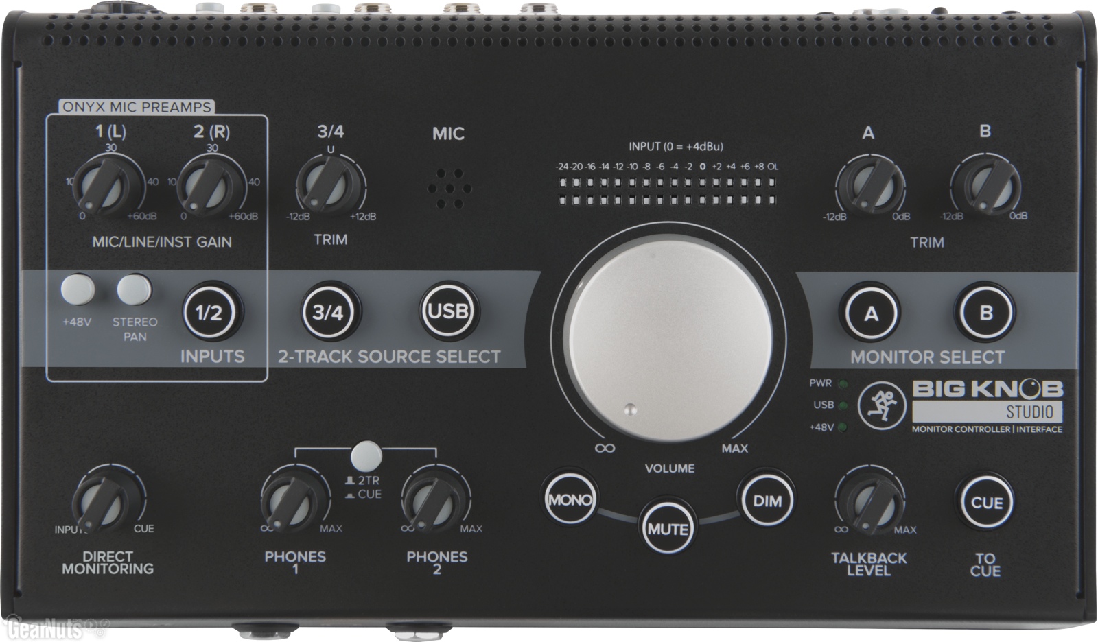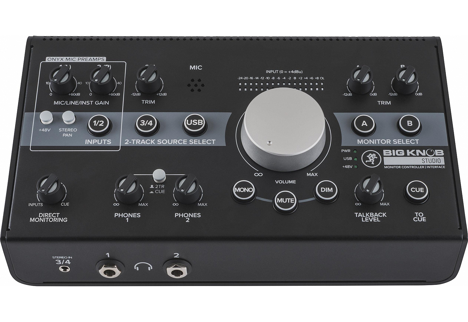 Το Mackie Big Knob Studio είναι ένα Monitor Controller με τροφοδοσία για σύνδεση μέχρι και 2 ζευγαριών Monitor και 3 διαφορετικών πηγών ήχου. Διαθέτει ενσωματωμένο USB Interface 2 x 2 στα 24-bit/96kHz, με μεγάλο ποντεσιόμετρο έντασης, διακόπτες για Mute, Dim, Mono, Monitor και Signal Source.