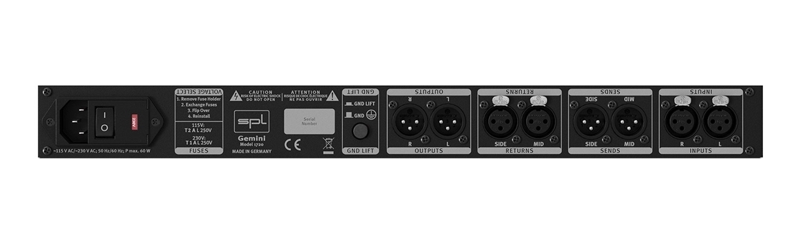 For example, it is possible (see figure above) to place the M/S encoder at processing position 3, an equalizer at processing position 4 for separate processing of the mid and side signals, and then the M/S decoder stage of the Gemini at processing position 5 to generate an L/R stereo signal again.