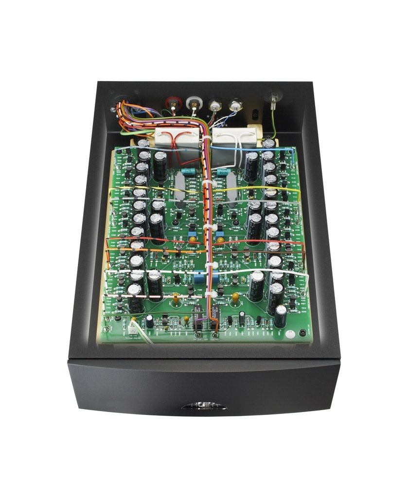 The heart of the SuperLine is a new, two-stage single-ended Class A discrete amplifier with part-passive RIAA filtering that runs off 25 internally regulated power supplies and features the transistor "quiet room" thermal isolation technique originally developed for the NAP 500 power amplifier. Environmental isolation is also ensured by the SuperLine's massive sub-chassis and high-Q spring suspension system - used here for the first time on a phono amplifier.