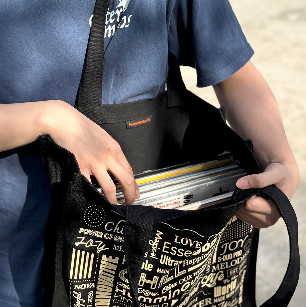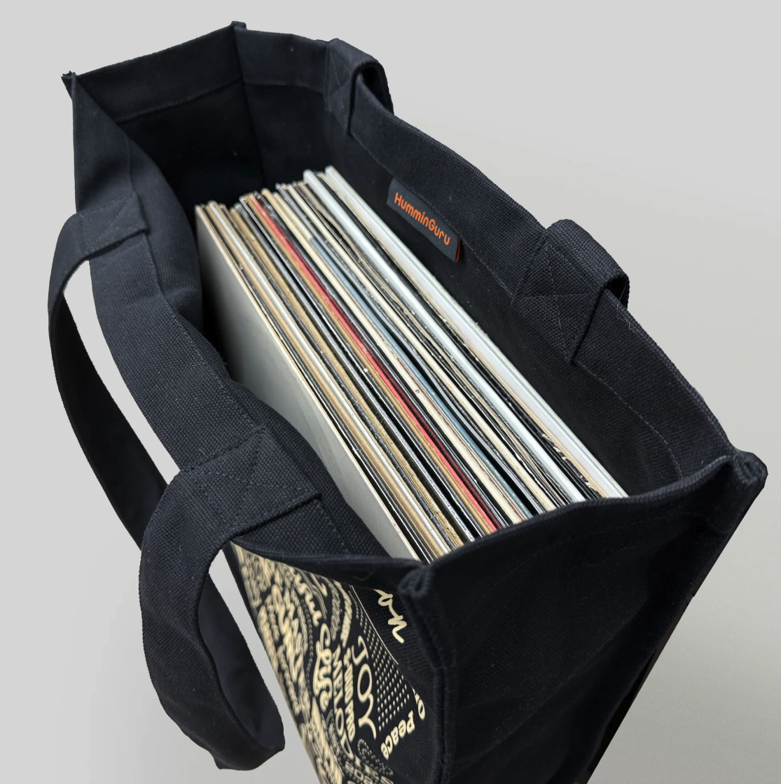 Crafted from durable canvas, this tote bag is tailored to house and transport up to 30 records, adept at handling heavy loads. Its sturdy design and roomy interior promise the safety of your vinyl treasures while on the move. The silk-screen print, infused with our collective love for analog music, is a heartfelt tribute to our shared passion.