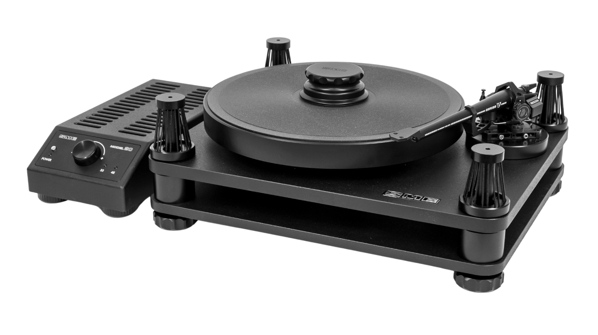 The Model 20 has superb instrument quality machining allied with fundamental physics, the higher the mass and stiffness of the body the less it will flex and vibrate; the duration of a vibration is shortened by advanced damping treatment. The Model 20 effortlessly addresses the problems of extraneous vibrations which emanate from numerous sources including air and structural vibration from loudspeakers, groove modulation, stray electrical fields and mechanical energy from moving parts. Weighing 26kg is significant in relation to its size as density matters. The main and sub-chassis plate thicknesses are 16mm and resists flexing at low frequencies whilst high frequency resonance is attenuated by efficient extensional damping. The definitive performance Model 20 is available with or without a tonearm. The tonearm option is the flagship SME Series V with contrasting Silver Printed Detail and Crystal Cable internal wiring.