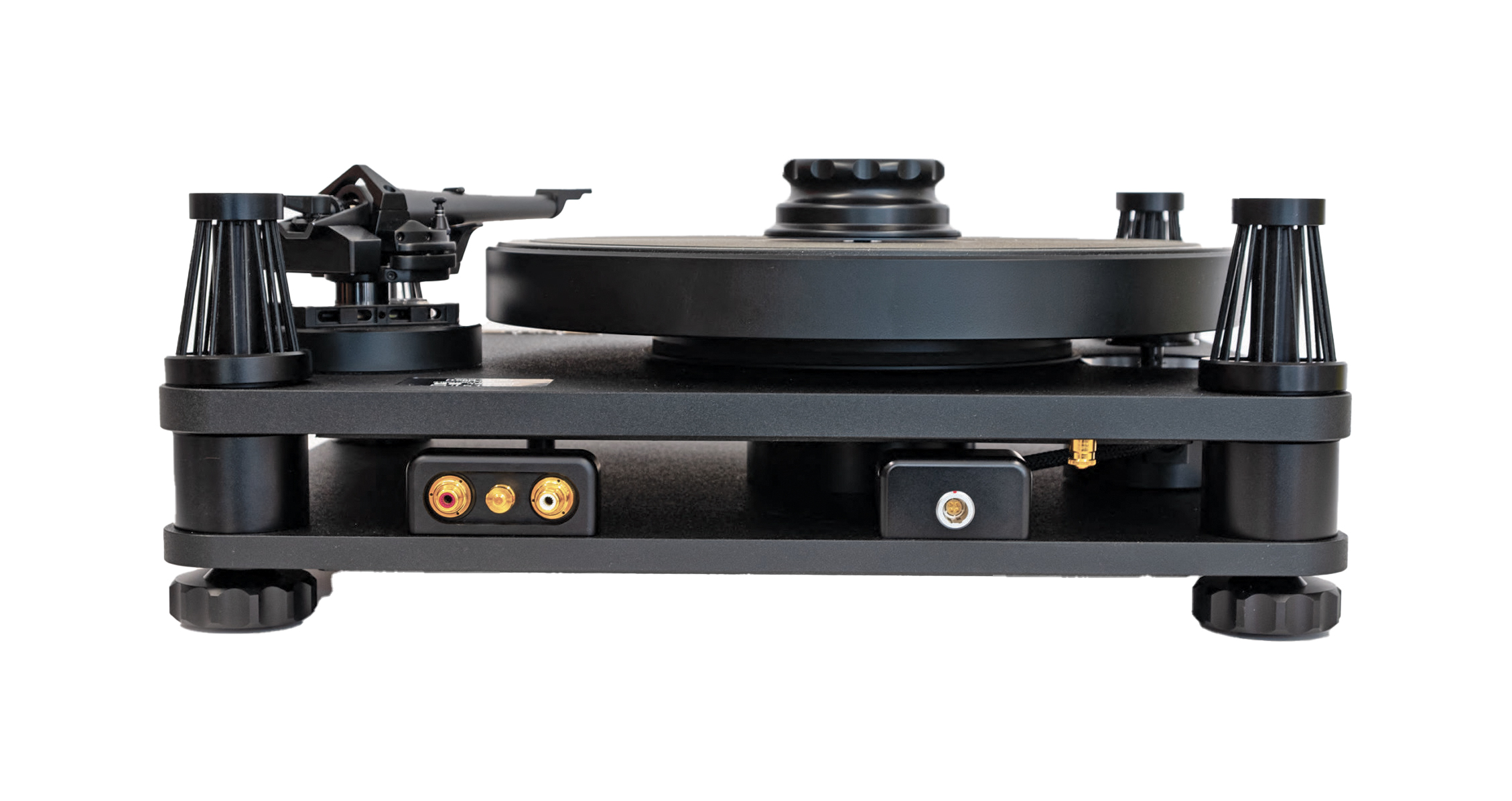 The platter is machined from aluminium alloy and weighs 6.5kg. Extensionally dampened and the top surface iso-damp mat is diamond-turned with a fine scroll for acoustic performance. This method of finishing upsets a myriad of tiny fibres which interface with the underside of the vinyl record. A substantial record clamp operating on the reflex principle ensures the largest possible platter contact even when appreciable record warp is present.