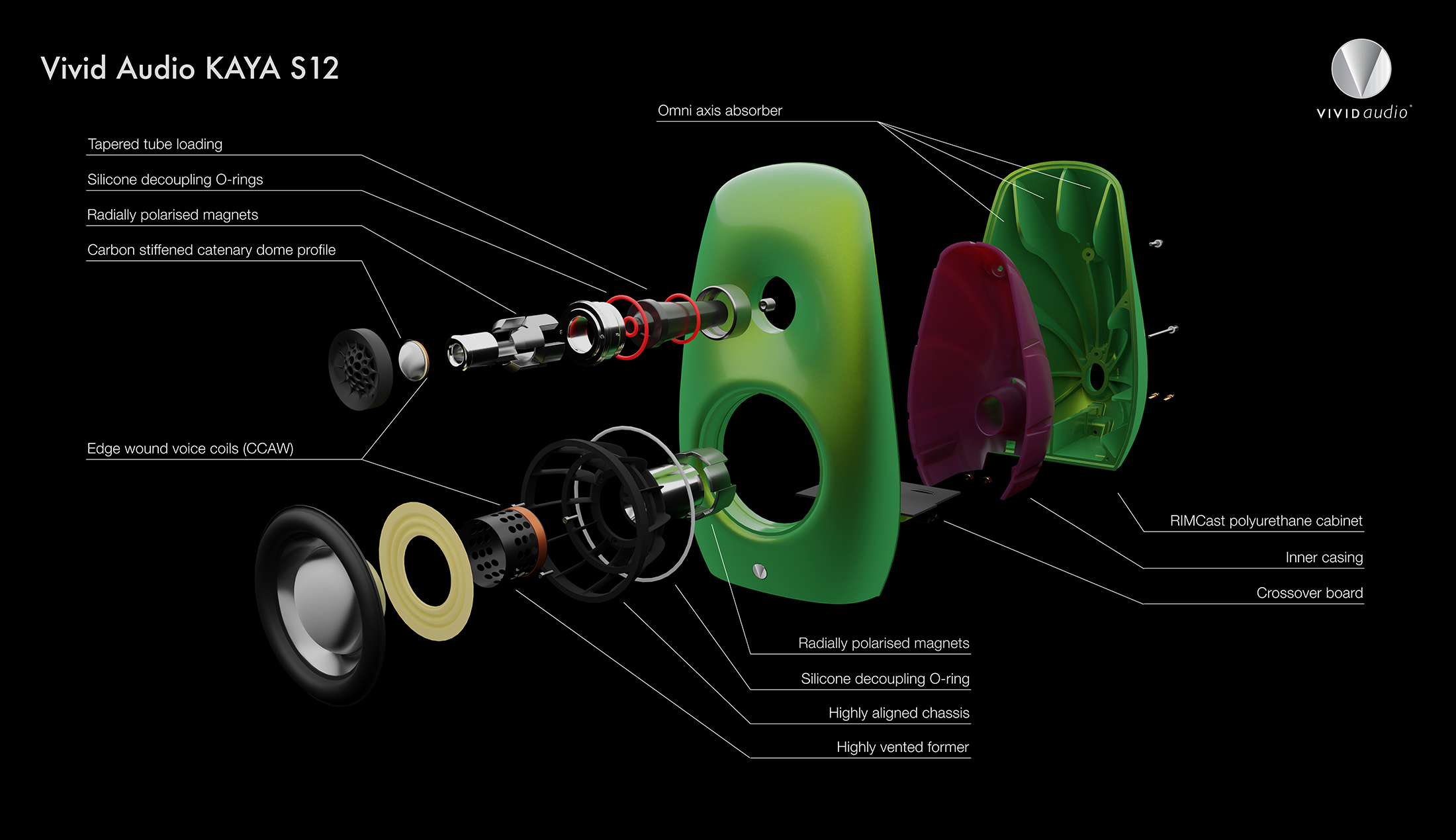 Crucially, and despite its diminutive 12 litre internal volume, the KAYA S12 uses the patented exponentially tapered tube loaded reflex, first developed for its much larger sibling, the GIYA G1, but wrapped around the inside of the enclosure in such a way as to absorb resonance in all directions. Enjoying this near-ideal loading is the newly-designed long throw C100L driver delivering clean precise bass and uncoloured transparent mids to a surprisingly high level. High frequencies are handled by the same tapered tube loaded high-performance D26 tweeter used throughout the entire Vivid range. KAYA S12 is moulded from composite material available in a range of standard and custom automotive finishes.