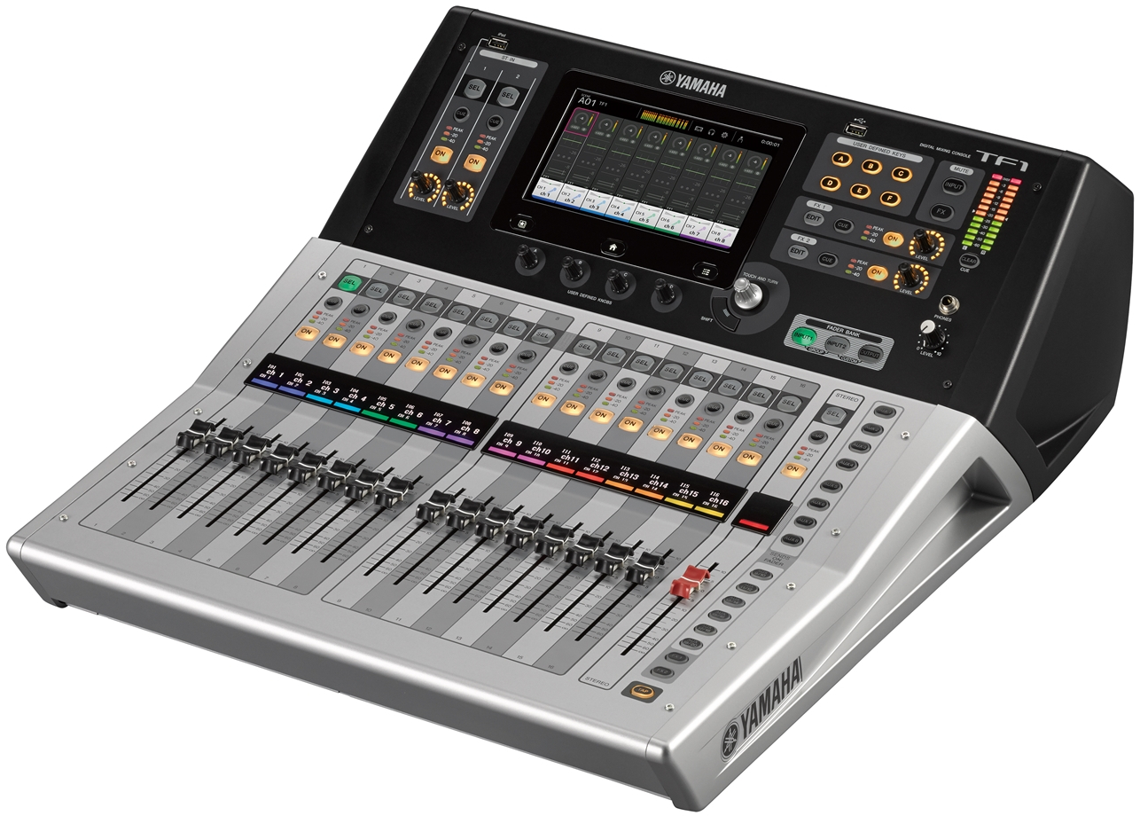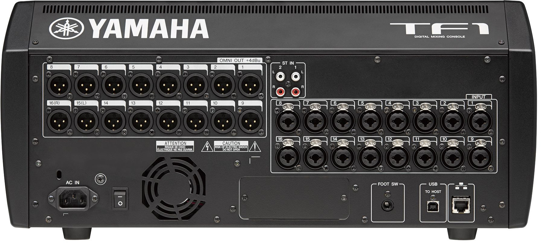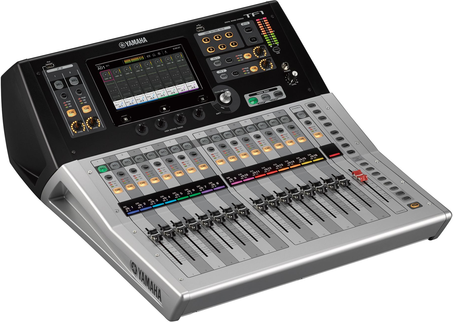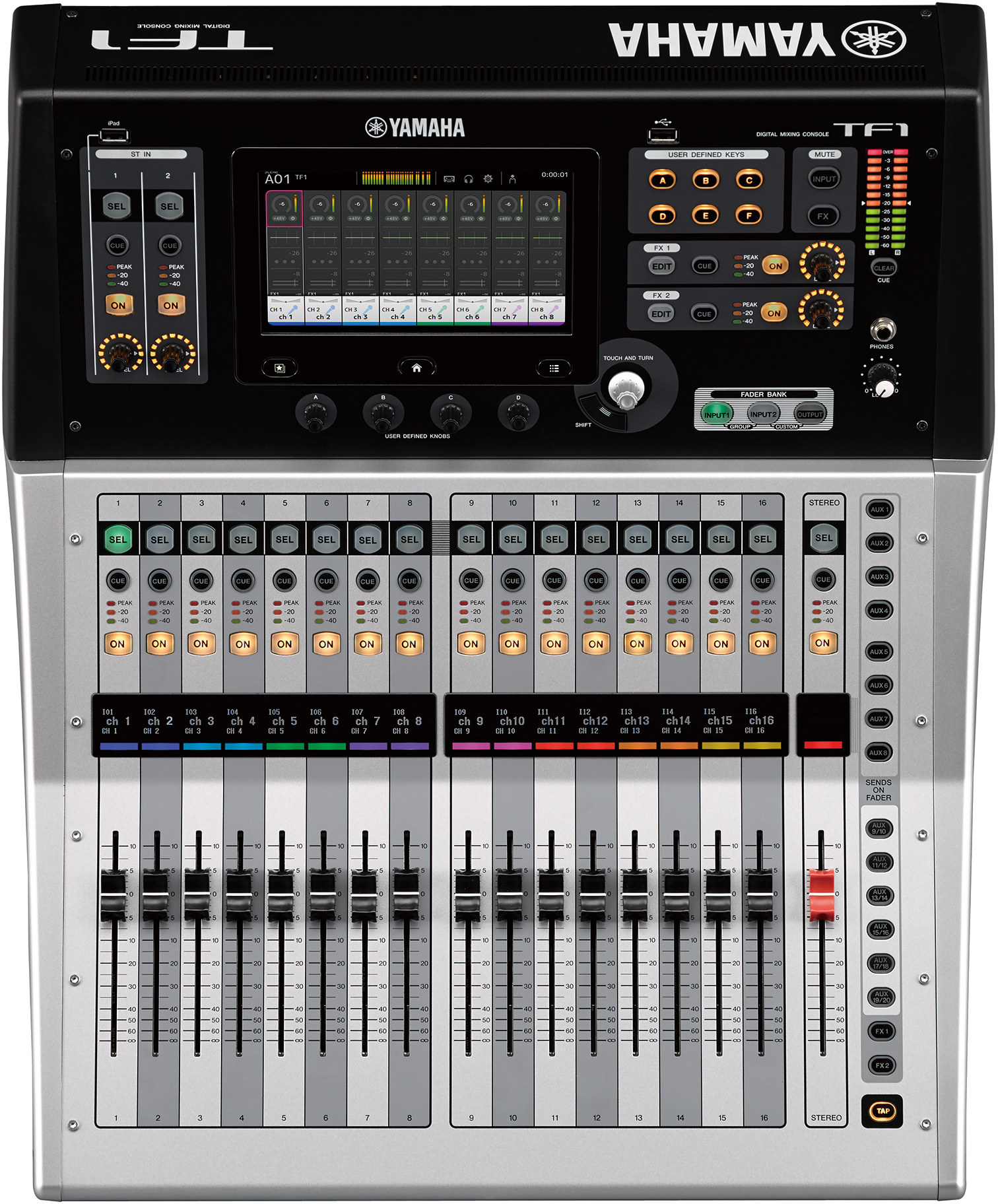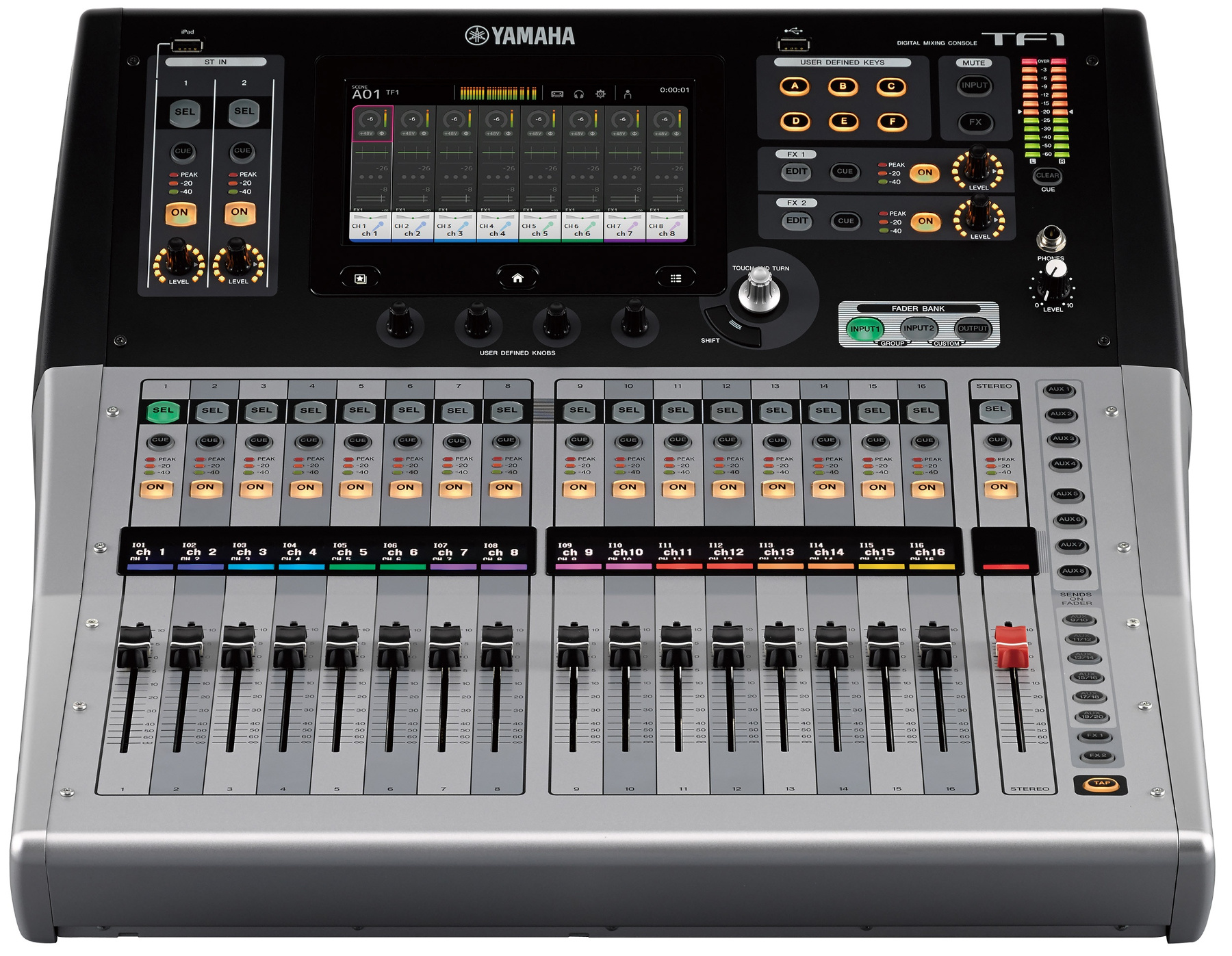 YAMAHA TF1 ψηφιακή κονσόλα για Live ( FOH και Stage) και Post Production, 16 mono είσοδοι με Combo XLR + 2 stereo με RCA, 16 omni έξοδοι. Εύκολος χειρισμός με έγχρωμη multitouch οθόνη και βάρος μόλις 13.5 κιλά. 17 faders (16+1 Master) motorised 100mm, παραμετρικό EQ 4 περιοχών full range, HPF, 2 δυναμικούς επεξεργαστές ανά κανάλι με Compressor, Gate κ.α., 8 μονάδες εφέ και 10 γραφικά EQ 31 περιοχών. Μίξη 32 + 2 stereo +2 return κανάλια, 20 Auxiliaries (8 mono +6 stereo), 8 DCA groups, Stereo Out.