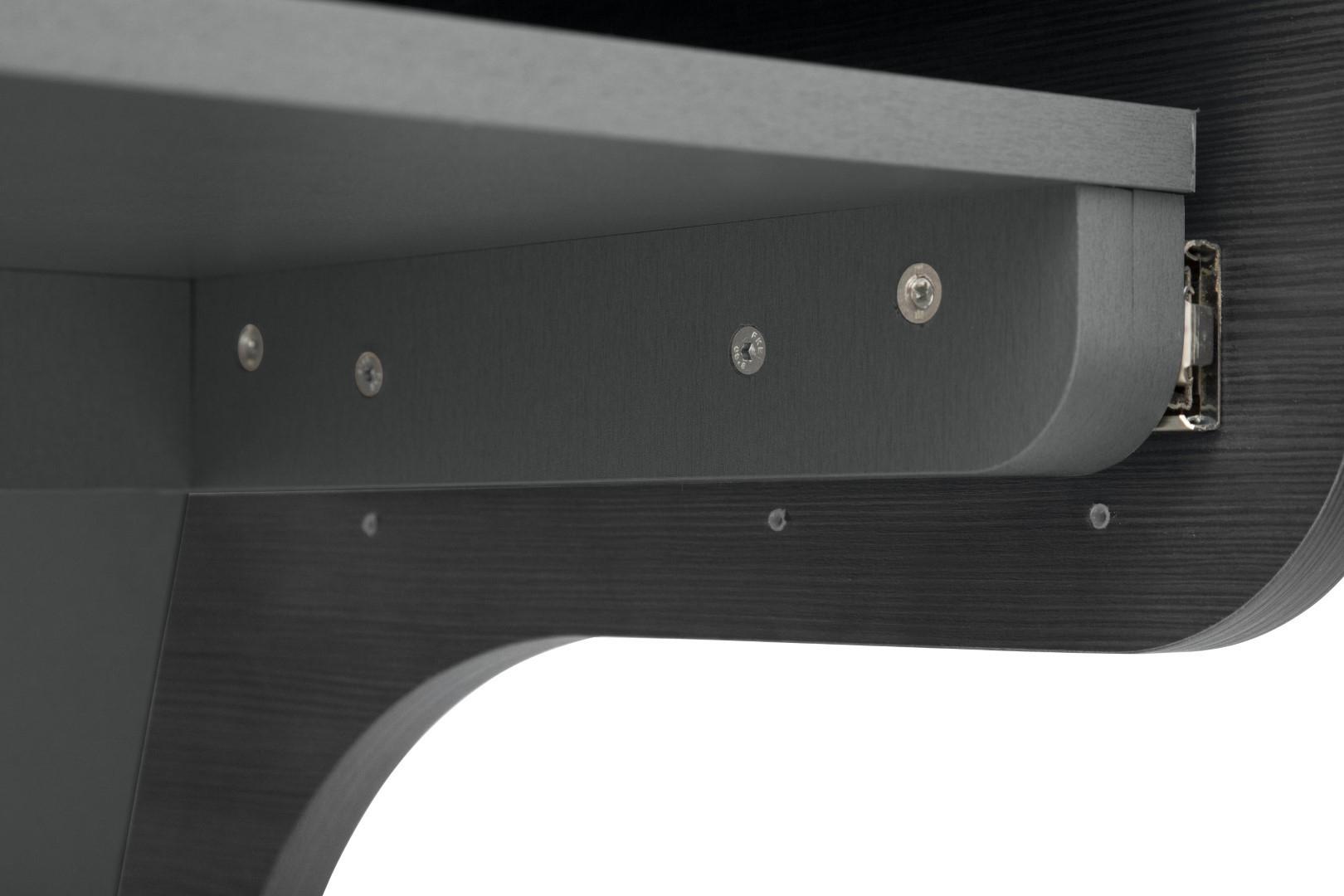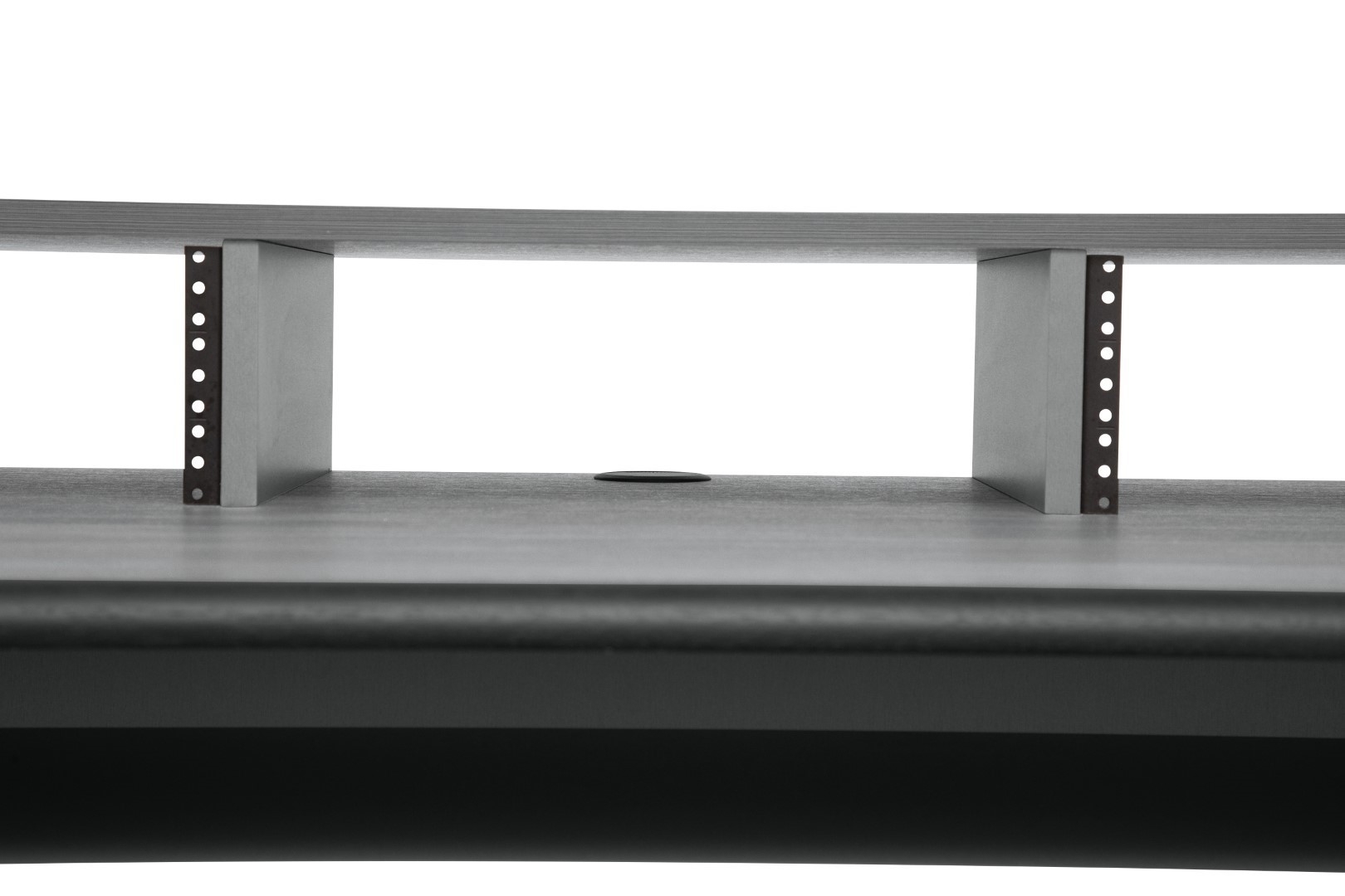 The pull-out keyboard tray can be adjusted to six different heights and holds a 76 or 88 key instrument. This new and updated version provides even more tray width for accommodating larger keyboards. Above the keyboard tray is the desk surface with room for keyboard and mouse and other desktop peripherals from small mixers to controllers. The centre of the desk offers space for the convenient and neat placement of accessories. On each side of the space, three rack units invite you to set up your 19-inch gear from sound expanders to preamps to monitor controllers. And if you do not require any rackspace, just leave out the rack rails and use the continued desk space to your liking.