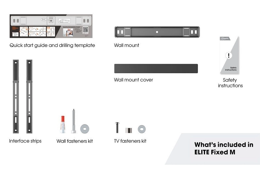 - What's in the box: Wall mount, Wall mounting kit with fischer® Duo Power plugs, TV fasteners kit, Spirit level, Quick Installation Guide, DrillRight™ AR app, Drilling template