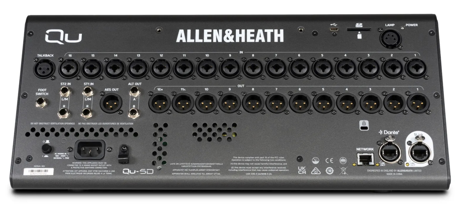 Allen & Heath Qu-5D, ψηφιακή κονσόλα, 32 καναλιών με 16+1 faders, πυρήνα 96kHz XCVΙ, ενσωματωμένη θύρα 16x16, 48/96kHz Dante, νέα μηχανή FX και συνδεσιμότητα Everything I/O. Διαθέτει οθόνη 7 ιντσών, οπτική απεικόνιση των καναλιών, επιπλέον SoftKeys και ρυθμιζόμενες από το χρήστη επιφάνειες λειτουργίας.
