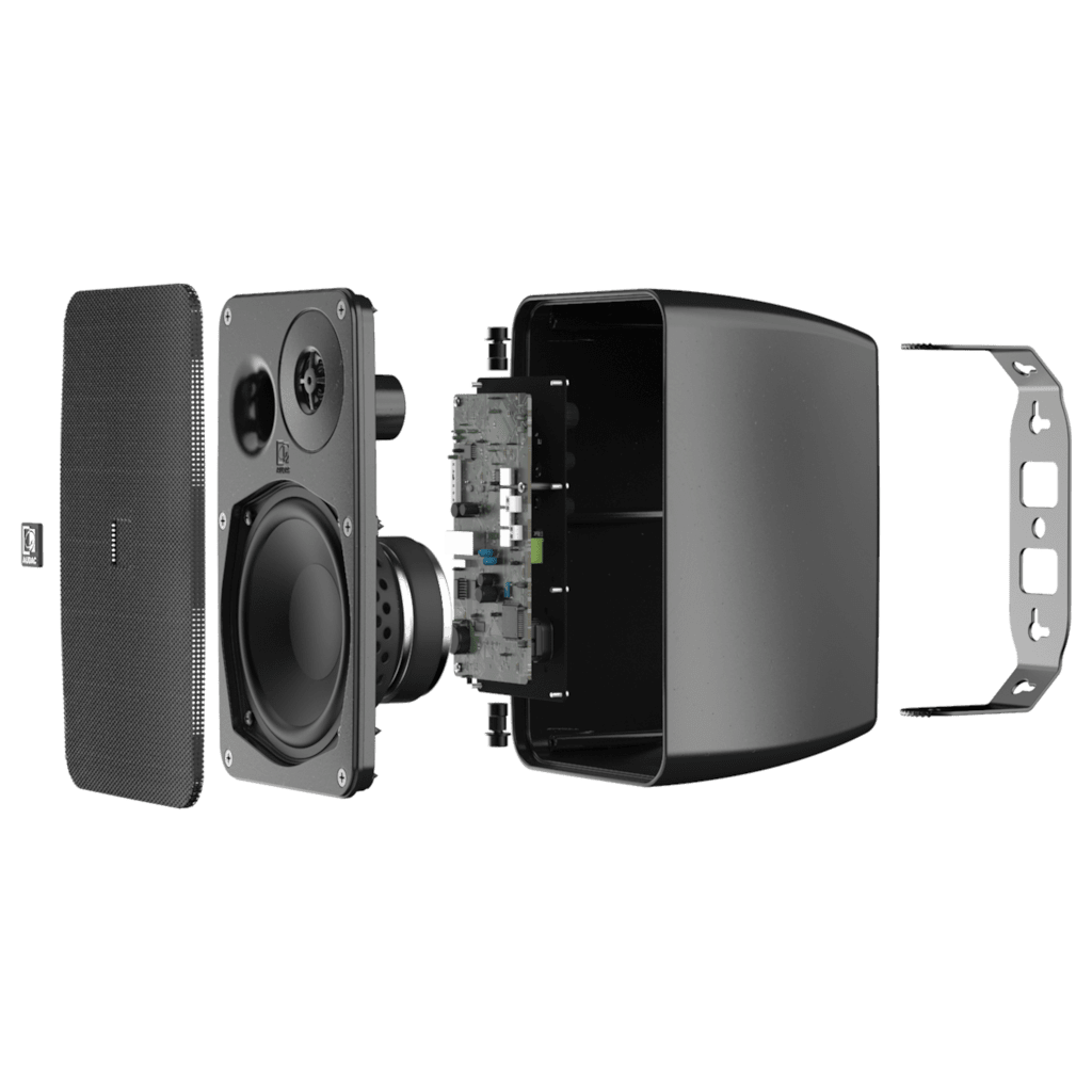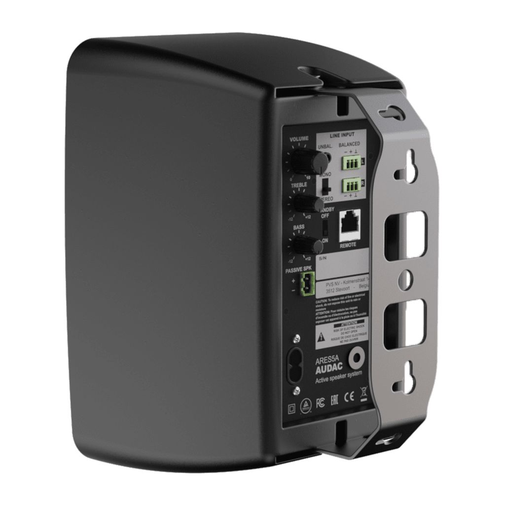 The integrated amplifier can deliver a power of 2 x 40 Watt and includes a stereo line input which is implemented balanced and unbalanced, allowing convenient connection to any kind of audio source. Unbalanced audio sources are connected through a 3.5 mm jack connector, while balanced sources can be connected to the terminal block input connection allowing long signal runs without interference. A volume potentiometer allows the user to adjust the level of loudness while the two-band tone control allows equalization of treble and bass. The auto-standby mode reduces power consumption when no input signal is detected. The active speaker includes a stereo amplifier module, also delivering the input signal to the passive unit.