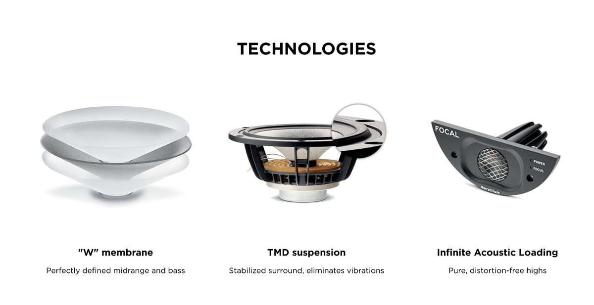 The ‘M’-shape concept was a design applied to Focal’s all-new 5" midrange drivers with a 'W'-membrane and the company’s 1.5" Beryllium tweeter. The M profile increases rigidity through reinforcement and the acoustic optimization of its magnet to avoid resonances. Focal says the dynamic range and transparency delivered by the 5" driver are unparalleled due to the ‘M’-shape moving in and out in a “perfect pistonic movement” producing a strong planar waveform that gives a true “phantom” center.