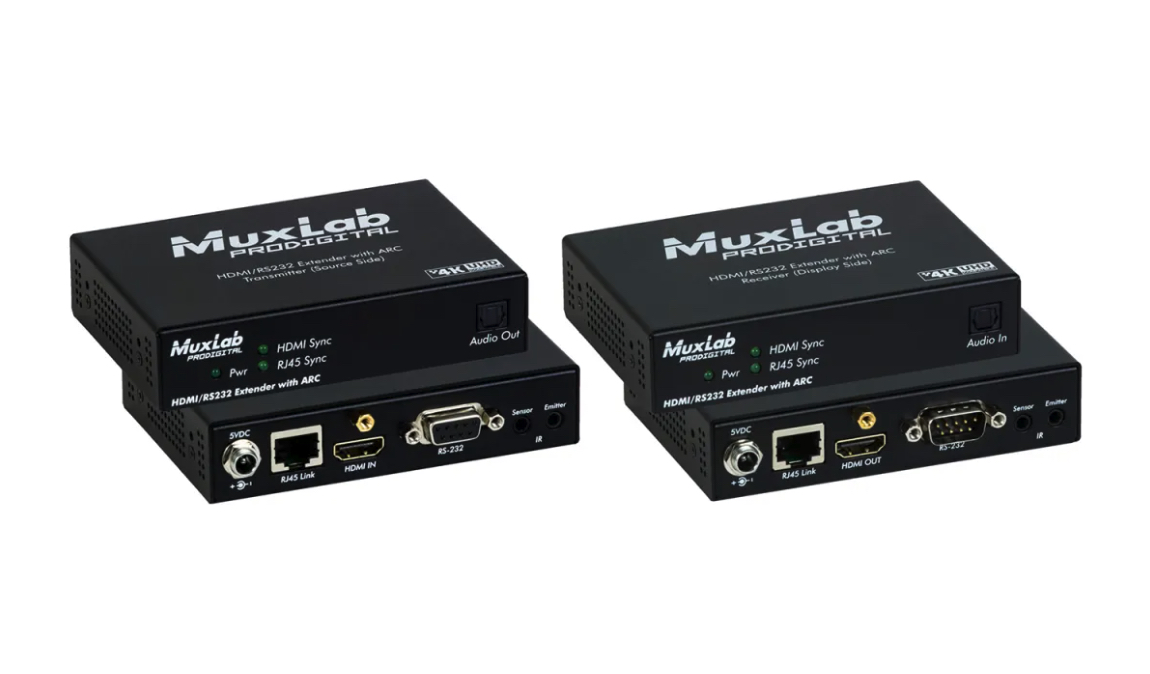 The kit supports Audio Return Channel (ARC), allowing the Receiver to return audio from a sink device such as a smart TV back to the Transmitter and on to an audio system. The originating ARC signal may be received via the HDMI or TosLink-in port of the 500458-ARC-RX and transmitted via the TosLink-out port of the 500458-ARC-TX. The unit is HDCP 2.2 compliant and supports RS232 and bidirectional IR pass through transmission for end device remote control. The kit includes one (1) transmitter, one (1) receiver, one (1) IR Emitter, one (1) IR sensor, and two (2) power supplies.