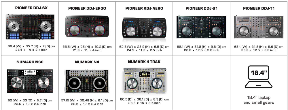 • Fits: Reloop Terminal Mix 4, NI S4, Denon DN-MC 6000, American Audio VMS4, Pioneer (DDJ SX, DDJ Ergo, DDJ S1/T1). Up to 18" laptop.