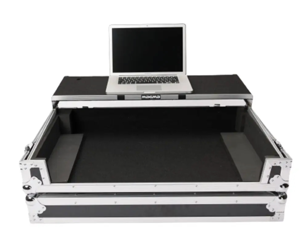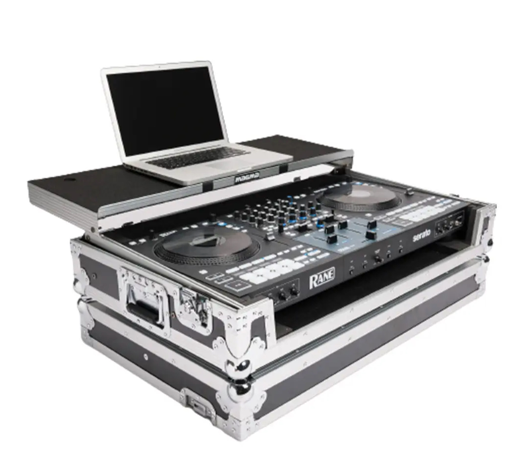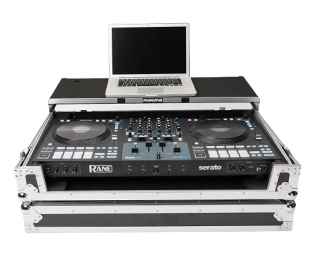 Magma DJ-Controller Workstation ψustomized to hold the new Rane Four DJ-Controller. Crafted from 9 mm vinyl laminated plywood, sturdy aluminum profiles, heavy duty butterfly latches and smooth rolling wheels, this case provides ultimate protection for mobile use on the road. Full padded interior keeps controller well-protected and it has detachable front cover/panel