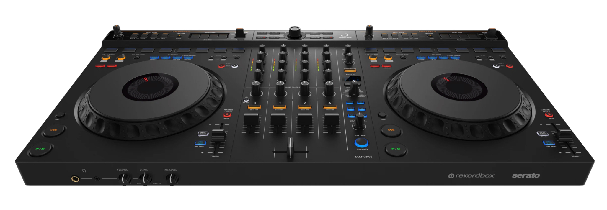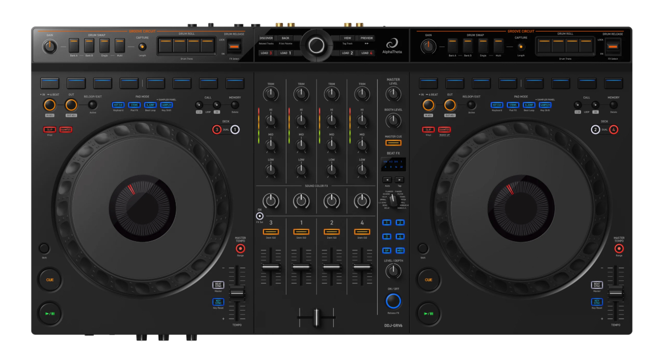 With its CDJ–DJM-inspired arrangement, AlphaTheta’s DDJ-GRV6 features an intuitive, versatile layout that’s been ergonomically arranged to maximize creative potential while maintaining a club-standard configuration. Its suite of Groove Circuit and Stems FX tools are placed on an elevated “step up” at the top of the controller to give you plenty of room for remixing and beat-swapping without worrying you’ll bump the jog wheels. Between the two areas, you’ll find each side hosts eight performance pads — just like the flagship CDJ-3000 — that expand your performance capabilities with expressive, customizable per-deck sampling, one-shots, and more. The centrally placed Smart Rotary Selector features a 2-axis tilt, in addition to standard rotation and push-selection operation, that streamlines navigation across media, tree views, and track listings, making pain-free work of building and adapting your set. Plus, the nearby Discover button lets you quickly access new music and time-tested classics, thanks to the intuitive Track Suggestion feature.