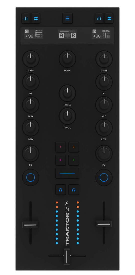- Three OLED displays + two VU meters for visual feedback on decks and levels