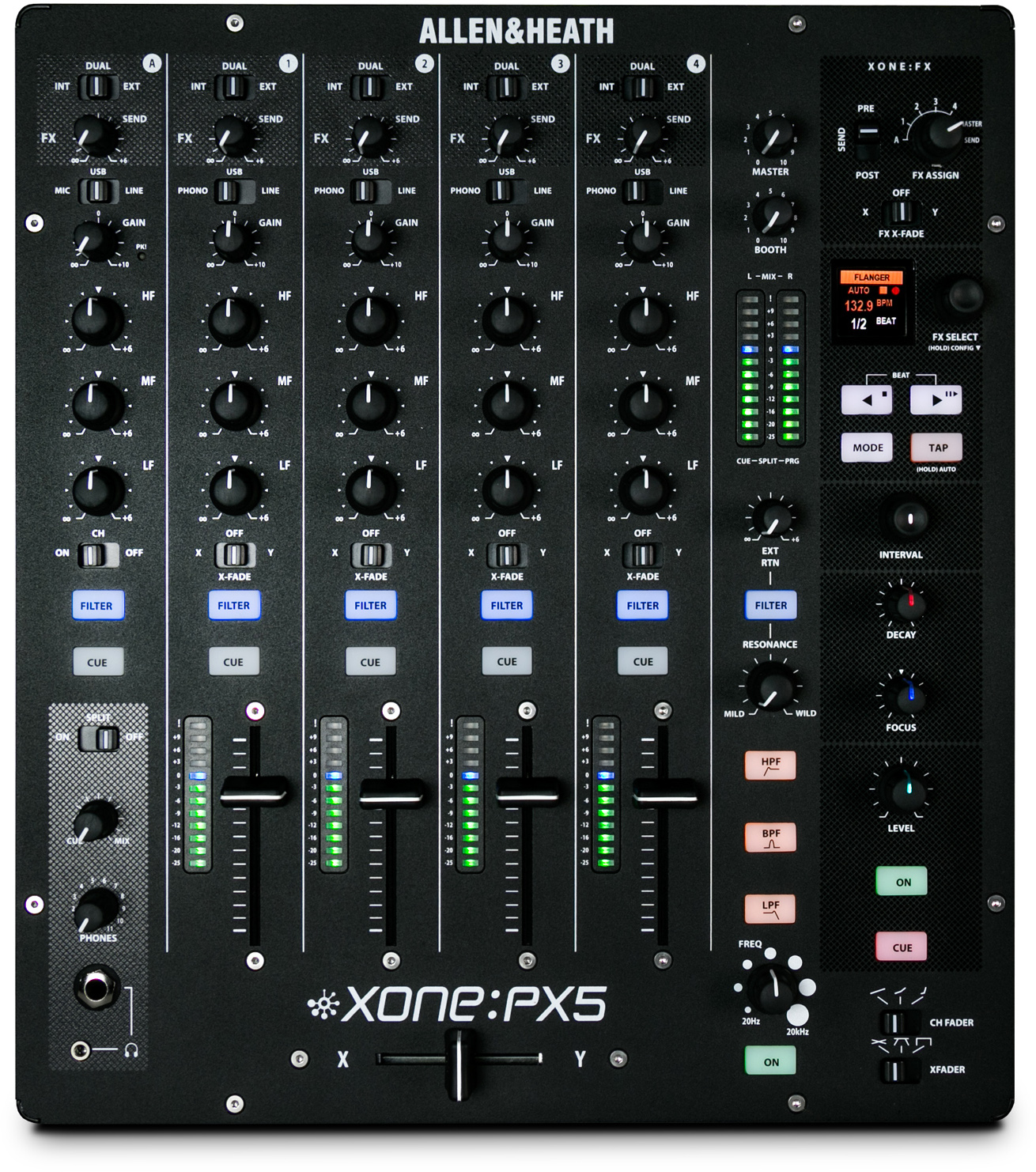 Combining the signature warm analogue Xone sound with class leading digital connectivity, Xone:PX5 breathes life and soul into electronic music performance. The built-in FX technology offers new levels of manipulation with our new Xone:Xcite FX suite of performance-focused delays, reverbs, modulators, flangers and distorters which are all assignable through simple hands-on control for fine-tuning the FX and expressing the DJ’s inner creativity. Xone:PX5 is a 4+1 channel mixer, equipped with the legendary Xone filter, 3 band EQ on all channels and an intuitive layout.