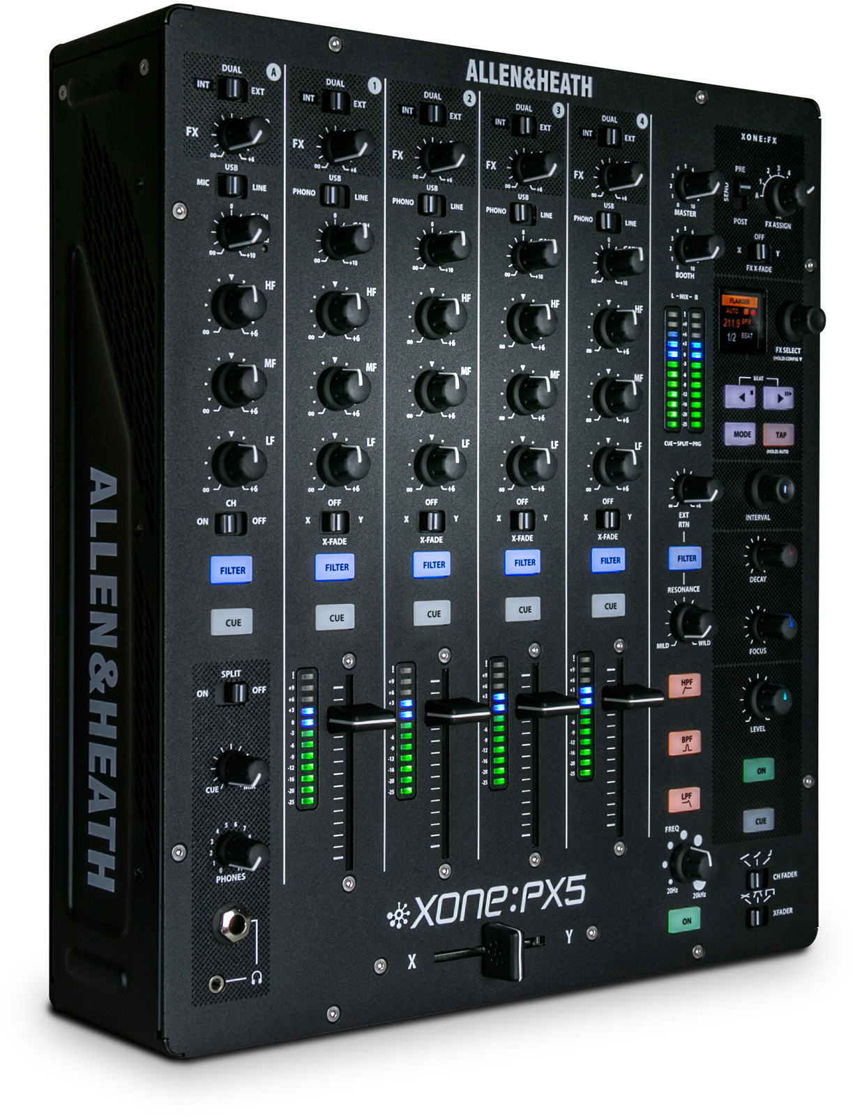 Xone:PX5 features the Xone:Xcite FX suite, a new breed of FX specifically tailored for DJ performance. The array of spectral delays, resonators, gritty reverbs and more is accessed through familiar, hands-on controls for instant, instinctive operation, making it easy to add energy and excitement to a track or create entire FX soundscapes. A hybrid FX mode combines the internal and external send & return FX for more advanced FX processing.