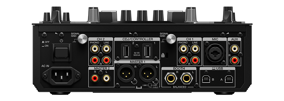- Outputs: 2 MASTER (XLR, RCA), 1 BOOTH (1/4 inch TRS Jack), 2 PHONES (1/4-inch stereo jack, 3.5-mm stereo mini-jack)