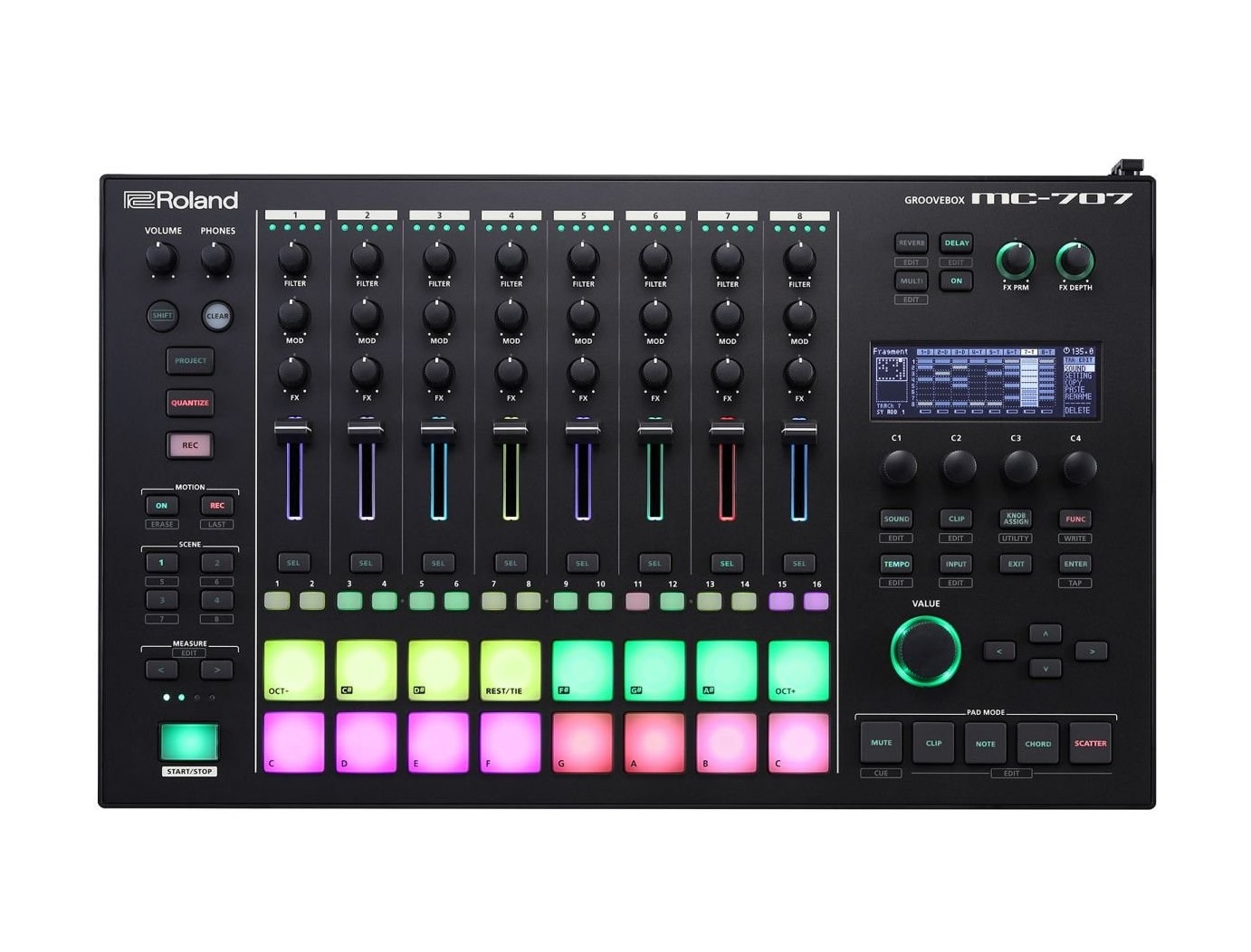 Loaded with hands-on controls, the MC-707 lets you dig in and shape your music in a visceral, physical way. Faders for each track let you immediately mix and arrange parts, and knobs can be freely assigned to whatever control you need for a sound. You can even record your knob movements, so they play back automatically. And the 8x2 pad array is not only great for playing drums—you can enter melody and chords with velocity, and trigger audio and MIDI clips as well.