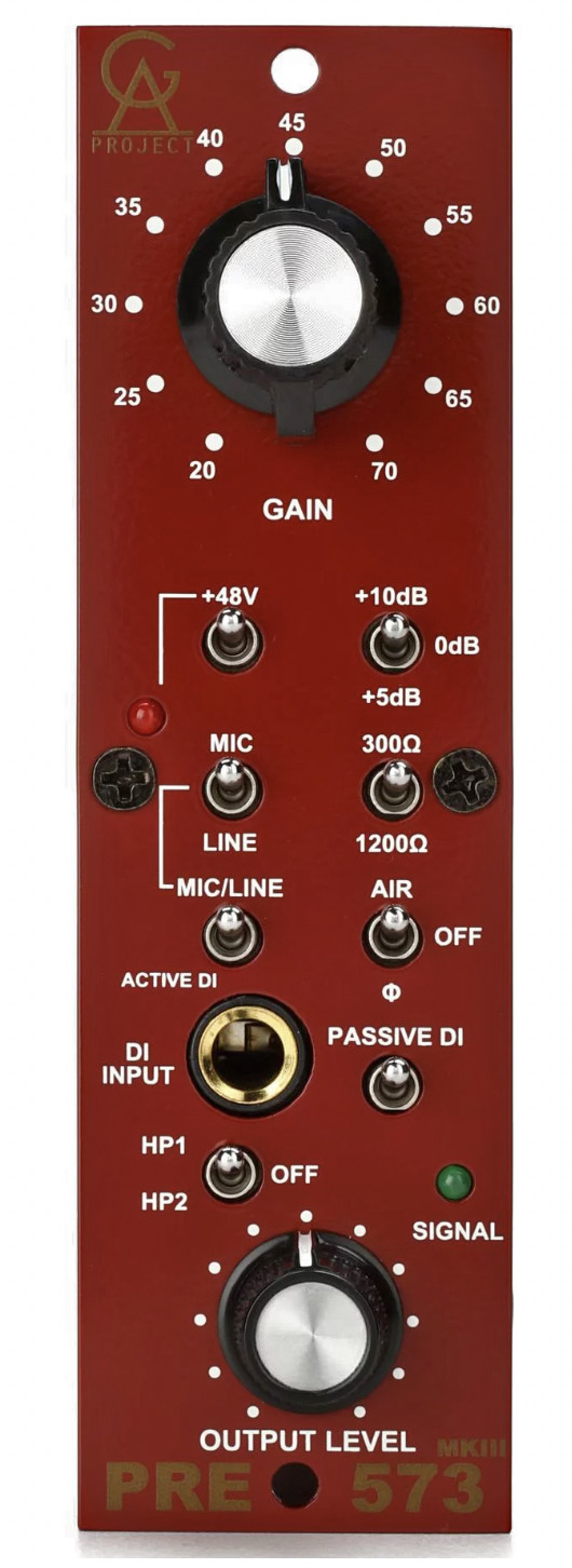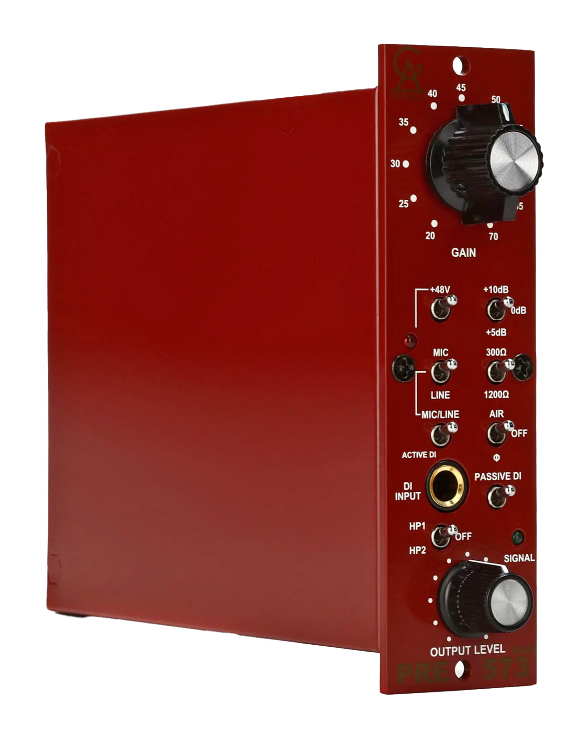 The PRE-573 MKII is a one width module for the api 500 format that has the sound and the features that made the PRE-73 so successful and a few additional ones. The circuit still uses the preamp and output section from the classic 1073-module, adapted to work in the api rack format. It has a total gain range from -10 to +80 dB. The 20 – 70 dB range is handled by a turn switch and there is a separate toggle switch to select an additional 5 or 10 dB gain. The input can be configured to accept line level signals by another switch, the gain is then lowered by about 30 dB and the input impedance increased to about 10 kohm.