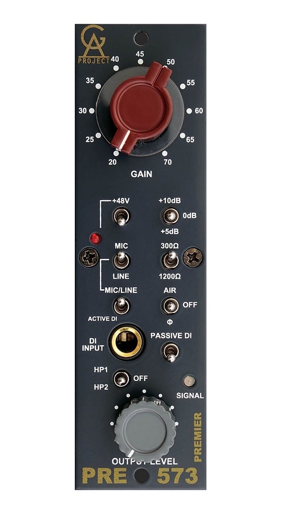 The PRE-573 PREMIER is a one-channel vintage style microphone, line and instrument preamplifier. The signal path uses only discrete components like resistors, capacitors and transistors. The microphone and line input and the line output are transformer balanced, using two different transformers, each one optimized for its purpose. This is the way audio components were built before integrated circuits became available. The subjective sound quality delivered by vintage equipment is often prefered to the one delivered by modern units, a situation that is even more obvious now when music is recorded with clean sounding digital audio equipment. The circuit used in the PRE-573 PREMIER is similar to the preamp section in the classical 1073 module with a corresponding sound character that is warm, punchy, sweet and musical. These classic characteristics have been heard on countless recordings through the years and it is a versatile sound that works very well on most sound sources and in most genres. The essence of this sound is now available at a surprisingly low cost, making it available to nearly everyone. Vintage Style electronics. No integrated circuits in the signal path.