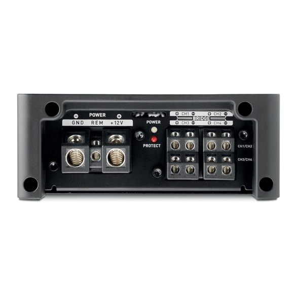 In bridged mode, it delivers 2x370 Watts RMS at 4 Ohms, enabling it to power a significant subwoofer channel with channels 3 and 4. It is also stable at 2 Ohms (4x185 Watts RMS) so it can also be used for powering different types of speaker drivers. In order to perfectly power the speaker drivers, each pair of channels is equipped with an adjustable active crossover from 50 to 500 Hz: high-pass, low-pass or wideband. Channels 3 & 4 are equipped with bass correction. The 2-/4-channel input modes ensure compatibility with mid-range head units only equipped with a pair output lines.