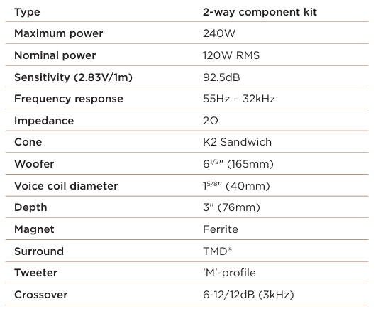 TMD® suspension, progressive-profile spider, aluminum frame, optimized coil ventilation system... K2 Power kits benefit from Focal's acoustic expertise for high power handling and precise, dynamic sound.