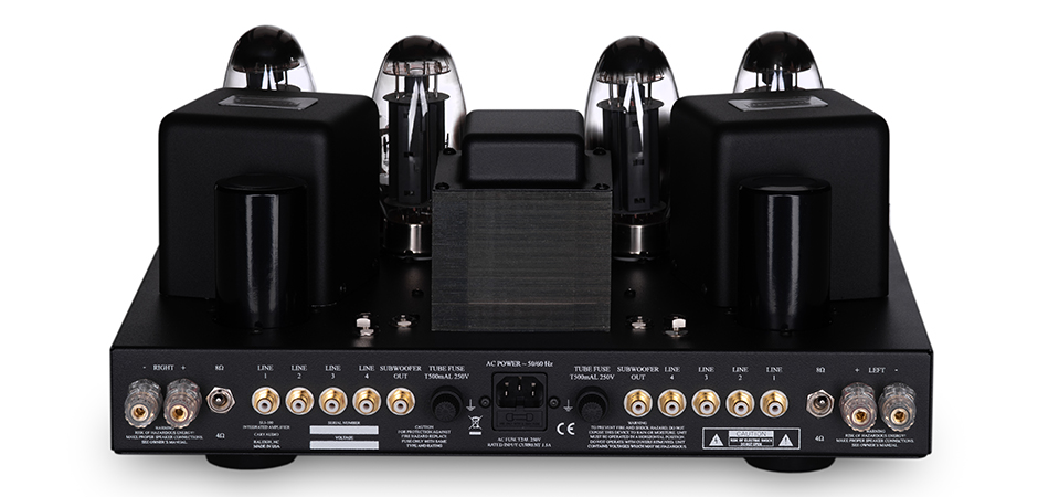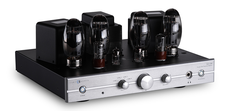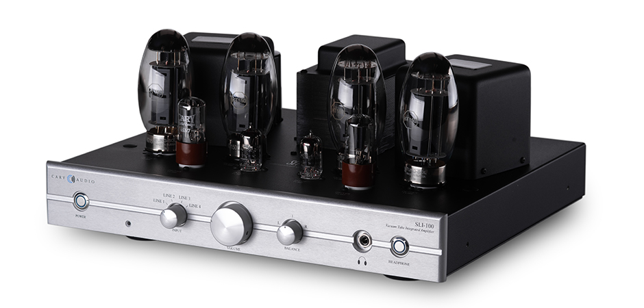 The KT150 output tubes are configured in push-pull and yield 100 watts/channel of output power. The output transformers in the SLI-100 are the most important component in the amplifier and have been specifically designed by Cary Audio for use in the SLI-100. Negative feedback is derived from the 8 ohm tap on the output transformer secondary. This feedback circuitry is used to reduce the noise floor and improve the speaker damping characteristics. Only 4 dB of feedback is utilized. The phase inverter is a self-balancing split load configuration utilizing the 6SN7 octal base dual triode. The preamplifier circuit is a Series Regulated Push-Pull (SRPP) Class A triode voltage amplification stage direct coupled to the phase inverter. The power supply in the SLI-100 features a 200% duty cycle EI laminate power transformer.