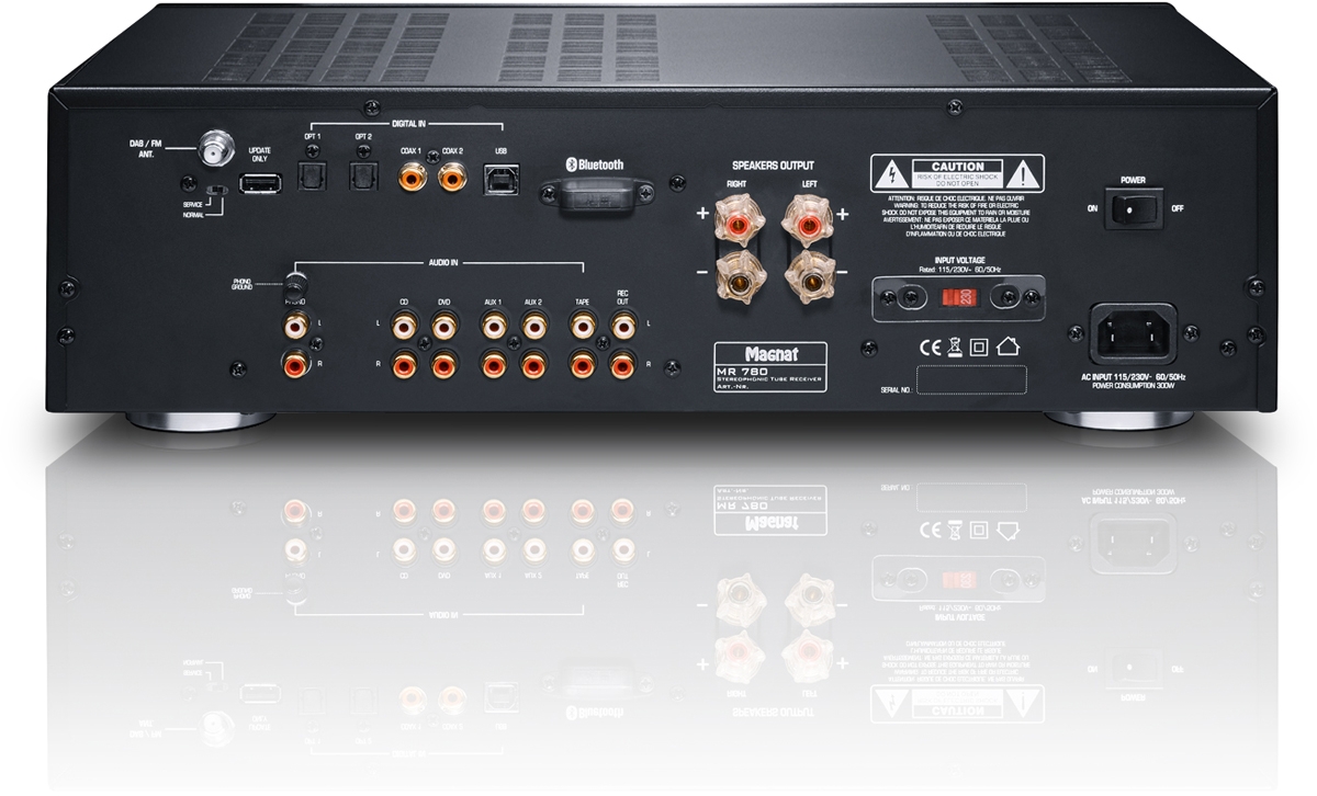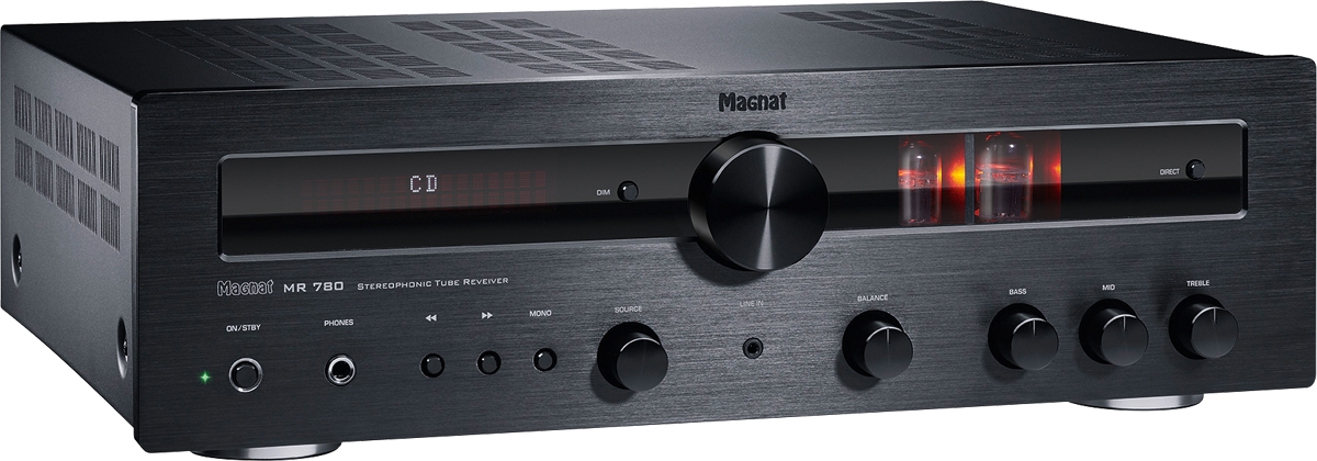 The Magnat MR 780 combines elegantly audiophile hi-fi sound with substantial power reserves: Used in the pre-amp stage are high-quality selected and extensively burnt-in ECC 81 valves, ensuring that well-loved, warm sound. The output stage relies on a low-emission toroidal transformer and provides an impressive 100 watts of RMS power per channel at 4 ohms. Added to this is a virtually overwhelming range of connection options for analogue and digital sources, including Bluetooth aptX. Where necessary, a high-quality Wolfson D/A converter takes care of the signal transformation with up to 192 kHz and 24 bits.
