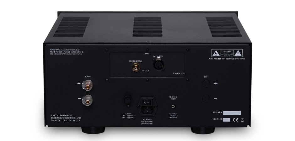 The SA-500.1 ES is a 500 watt monoblock amplifier into 8 ohms, (1000 watts into 4 ohms), with balanced and single ended inputs. The amplifier exhibits very high current capability, is stable into low impedance loads, and features 3 dB of dynamic headroom.