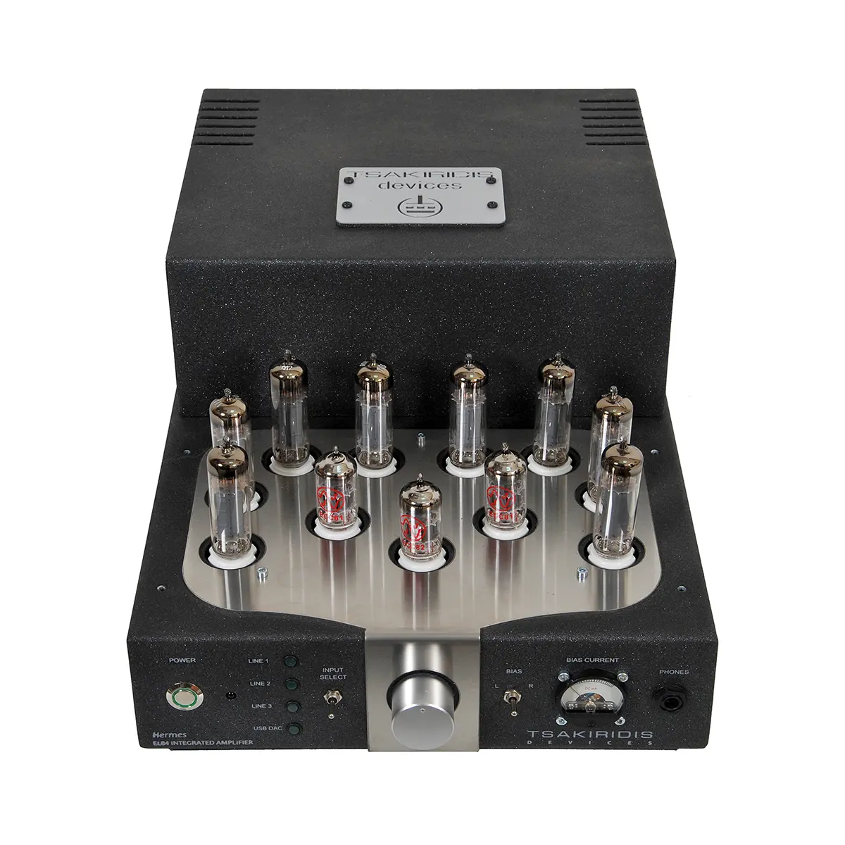 Hermes uses the EL84 tube which is widely acknowledged for its full and high quality sound. Arranged in a double push-pull configuration to obtain enough power to drive a wide range of loudspeakers. The self biasing circuit is a nice convenience for the user.
