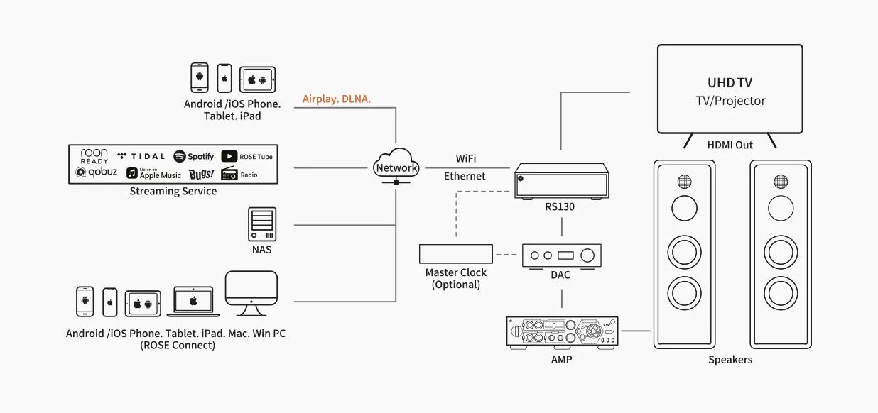 - Supported Streaming Platforms: Airplay, DLNA, Roon Ready, Spotify Connect, BluetoothSupported Streaming Services: TIDAL, Qobuz, Apple Music, Bugs, ROSE Tube, Internet Radio, ROSE Podcast