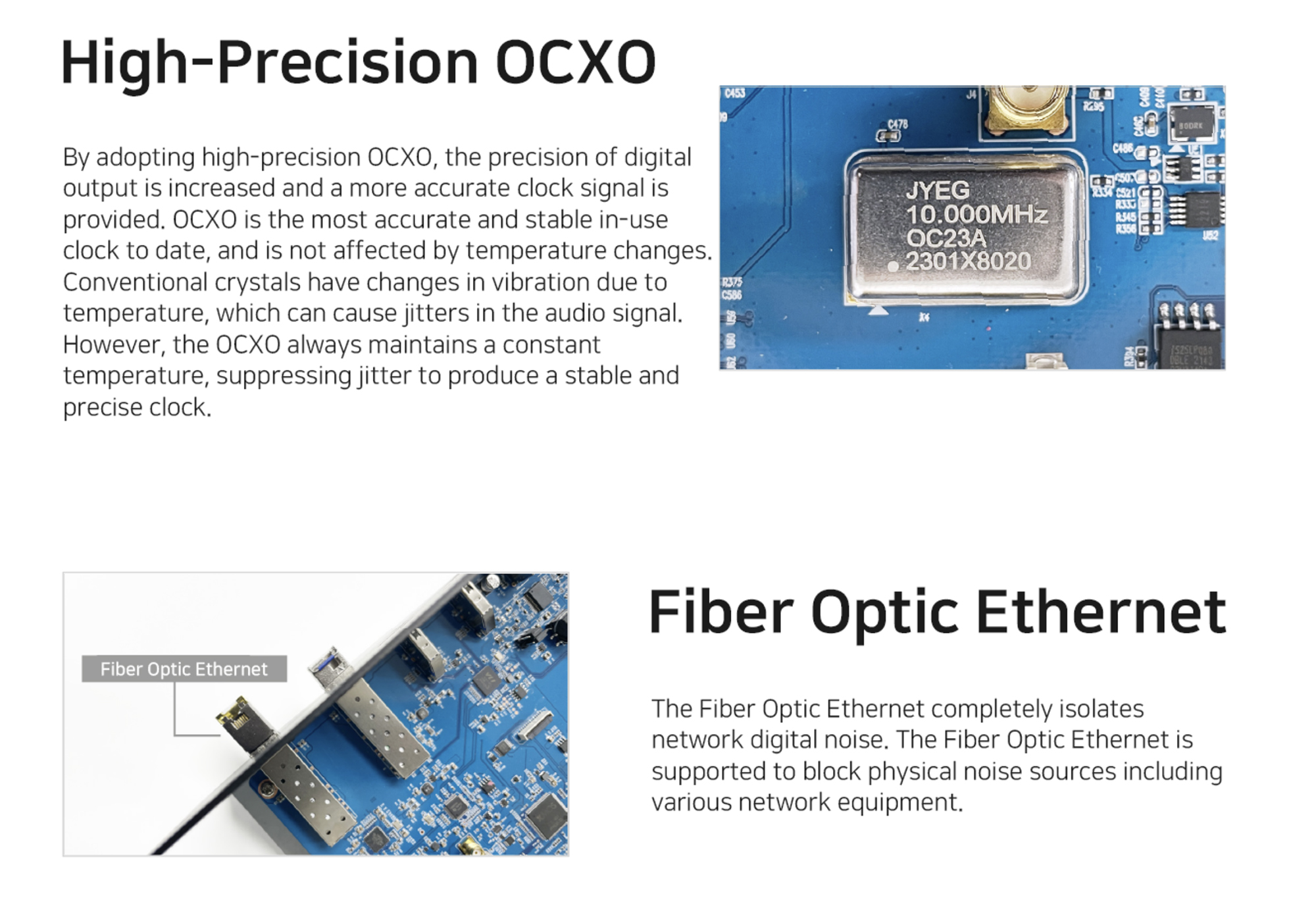 With a focus on delivering pristine sound, the RS130 is engineered to eliminate digital noise and ensure stable output. Its support for Fiber Optic Ethernet and Fiber Optic USB effectively blocks unwanted noise sources, allowing you to indulge in pure audio bliss. The built-in high-precision OCXO clock guarantees precise timing, maintaining a constant temperature for stable and accurate clock signals.