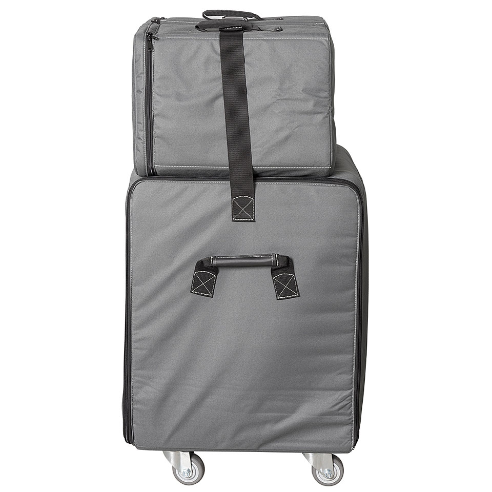 A three-piece, modern protective sleeve set in dark gray. Consists of a subwoofer sleeve with integrated roller board and two satellite sleeves – all three sleeves feature handy circumferential zip openings – for the safe and easy transport and storage of LUCAS 2K.