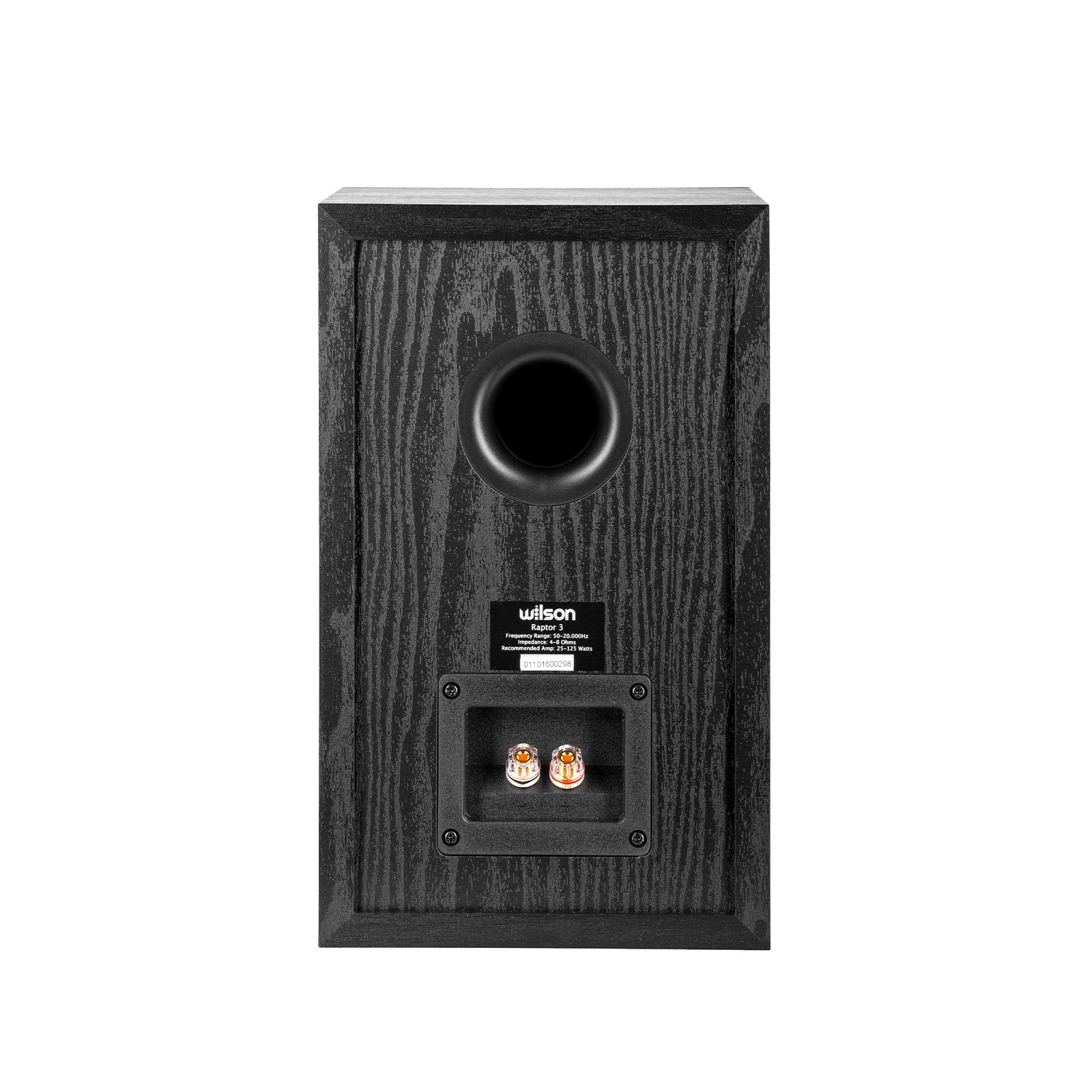 Wilson Raptor 3, passive, 2-way, bookshelf Hi-Fi speaker recommended for amps 25-125 Watts, 4-8 Ohm impedance, max SPL 108dB and 88dB sensitivity. Raptor 3 is technically and visually a perfect match for the other speakers of the Raptor series. it can be configured as a home theater system or as a stand-alone small Hi-Fi speaker system, where it works best.