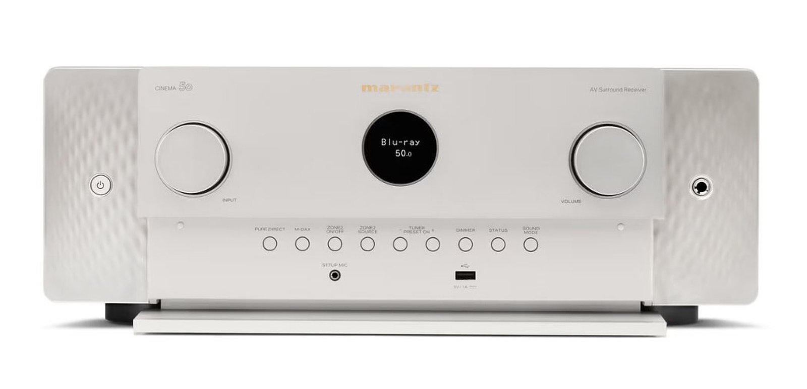 A modern expression of timeless design principles, CINEMA 50 features the iconic Marantz porthole, symmetrical design, and front panel controls elegantly hidden from view.