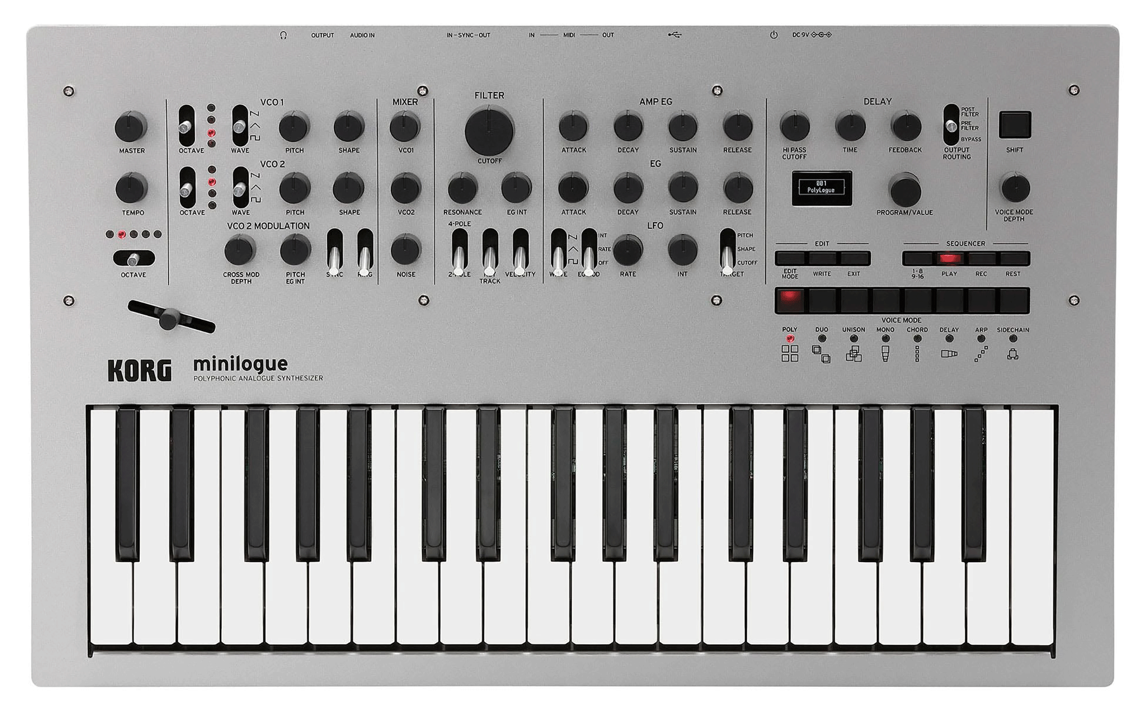 Korg minilogue is a stylish, innovative 37 key fully programmable analog polyphonic synthesizer boasting newly developed analog synth circuitry that provides a rich, diverse sound palette. 200 programs (100 Presets / 100 Users).