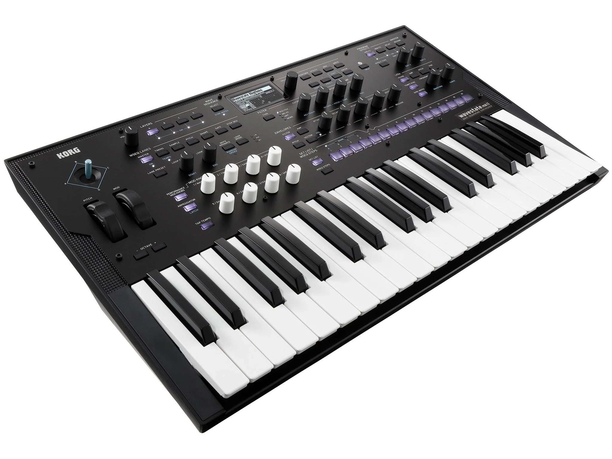 The Korg Wavestate MKII Wave Sequencing Synthesizer uses Korg's legendary wave sequencing synthesis to deliver a staggering collection of ever-evolving sounds, textures, and rhythms that are organic, and vastly explorable. This new version of Wavestate elevates the popular synth, increasing the number of voices (96 stereo voice polyphony), personal sample space (4GB), and boasting a refreshed look with a unique color accent.